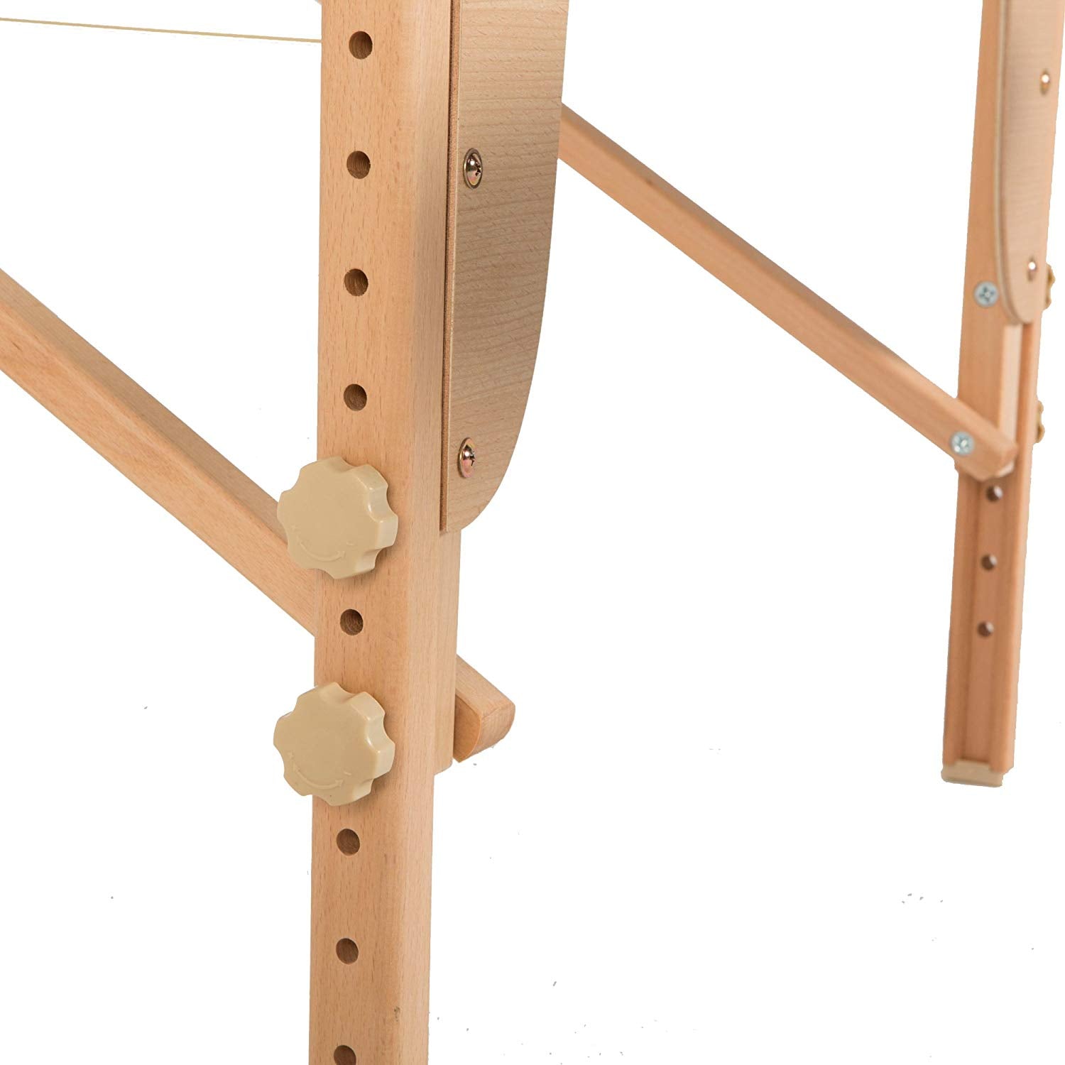 11 Easy table height level adjustments (24” – 35.5” H). Frame construction is made of European beech hardwood.