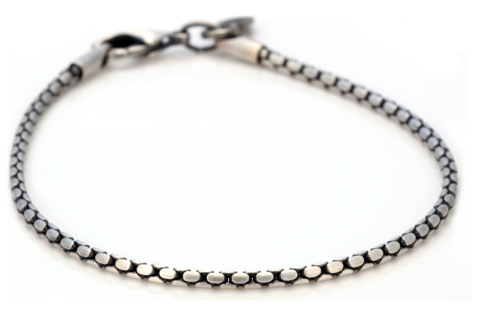 This chain is made from solid brass which has been plated with pure silver, oxidised, hand sheened, then coated with a transparent protective layer to extend the wear life. Available Lengths: 7, 8, and 9 inches