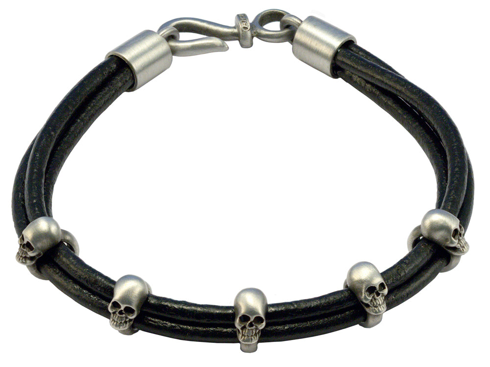 An original and unique design combining 3 strands of 3mm black leather cords with 10 movable pewter rings.
