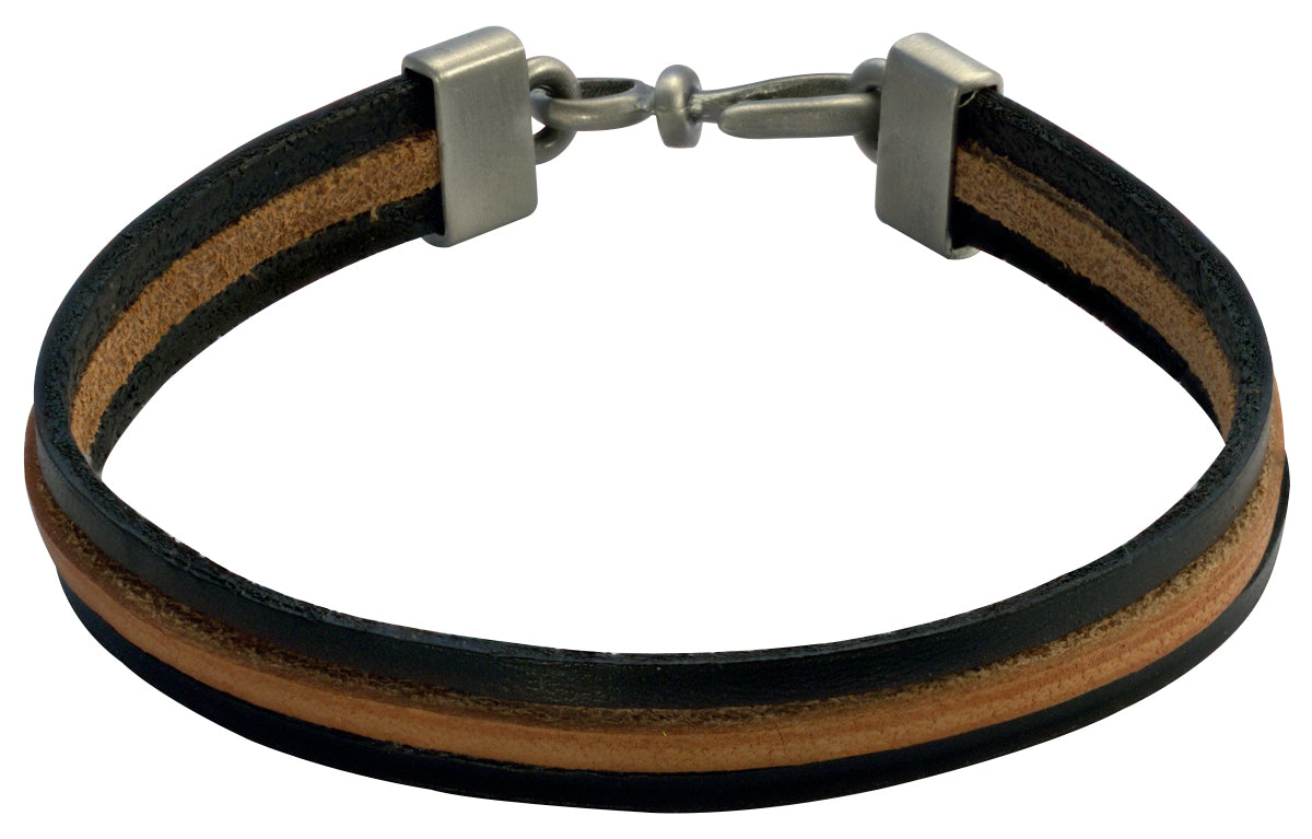 A classic wrist wrap combining a three 2mm by 5mm black & brown leather straps with a solid pewter connector oxidised black and then hand brushed to create highlights and a matte finish.