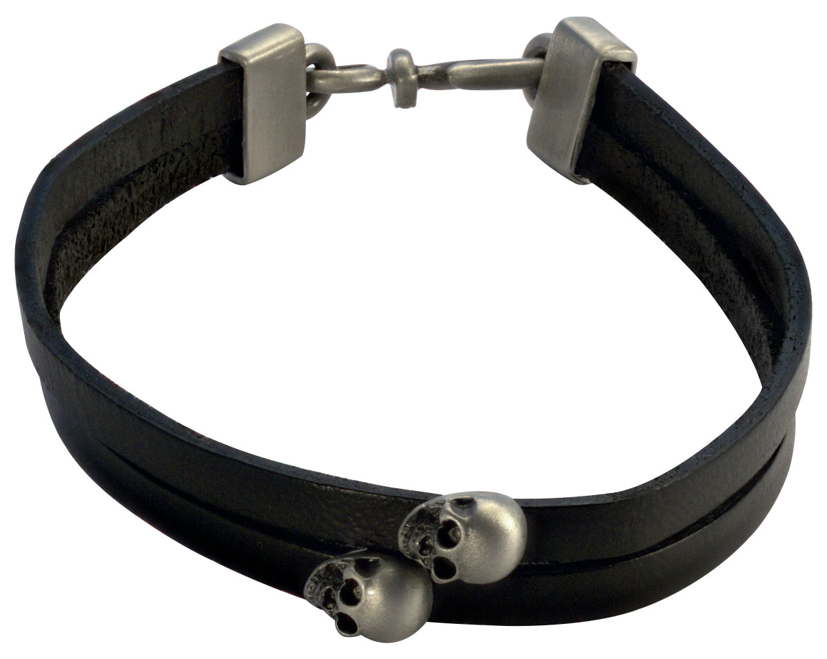 A classic wrist wrap combining two 2mm by 5mm black leather straps with solid pewter skull elements and connectors oxidised black and then hand brushed to create highlights and a matte finish.