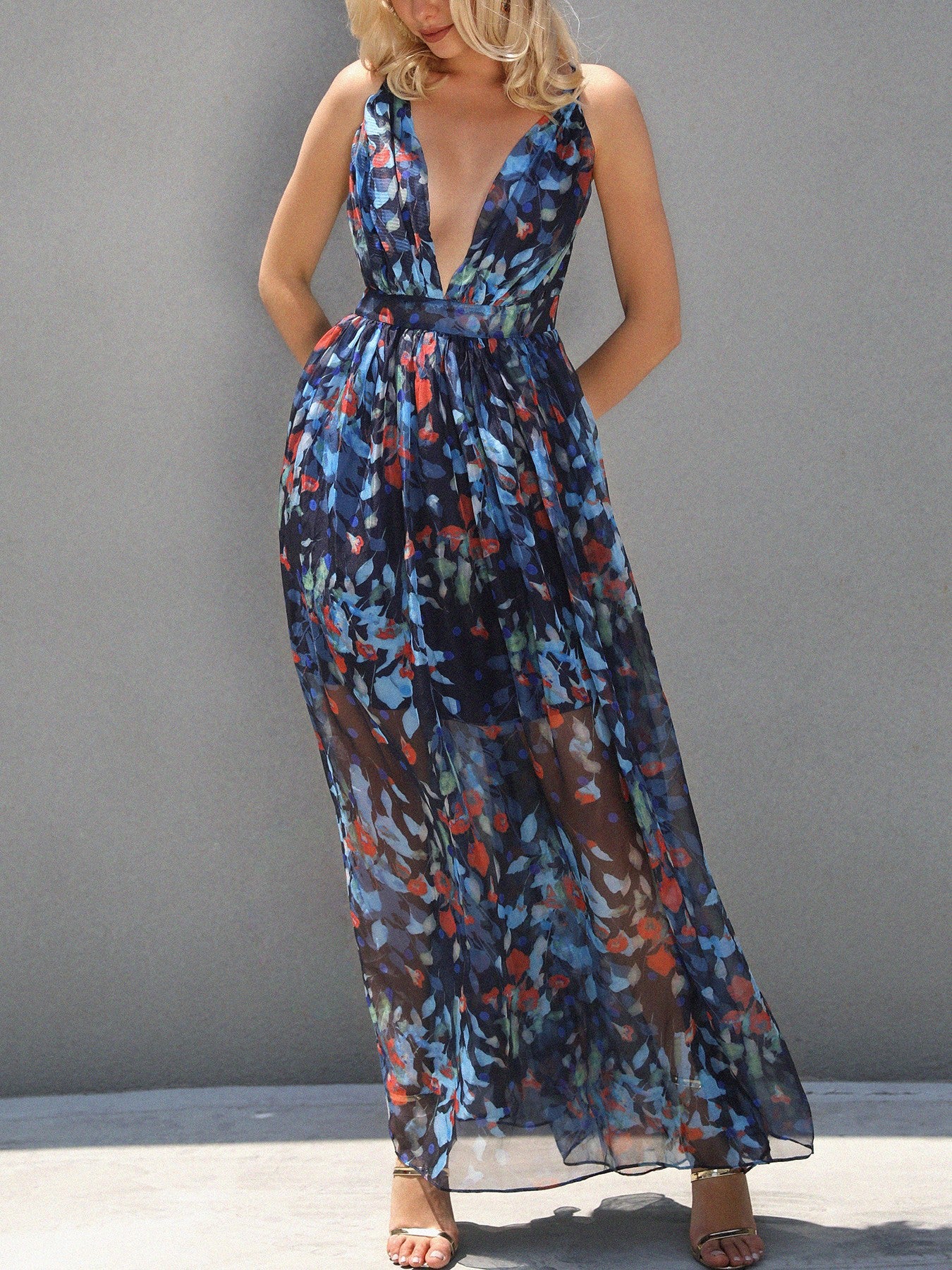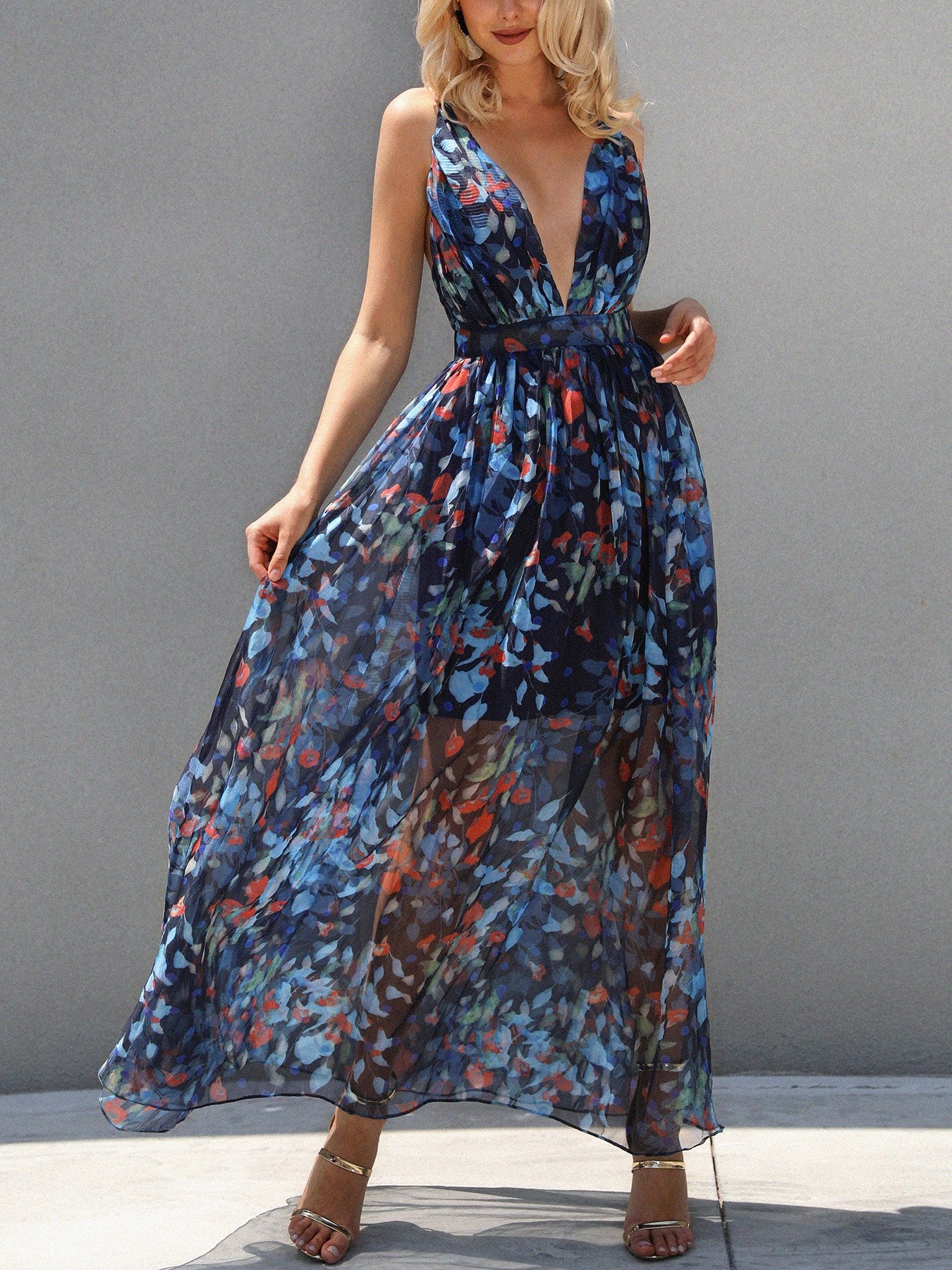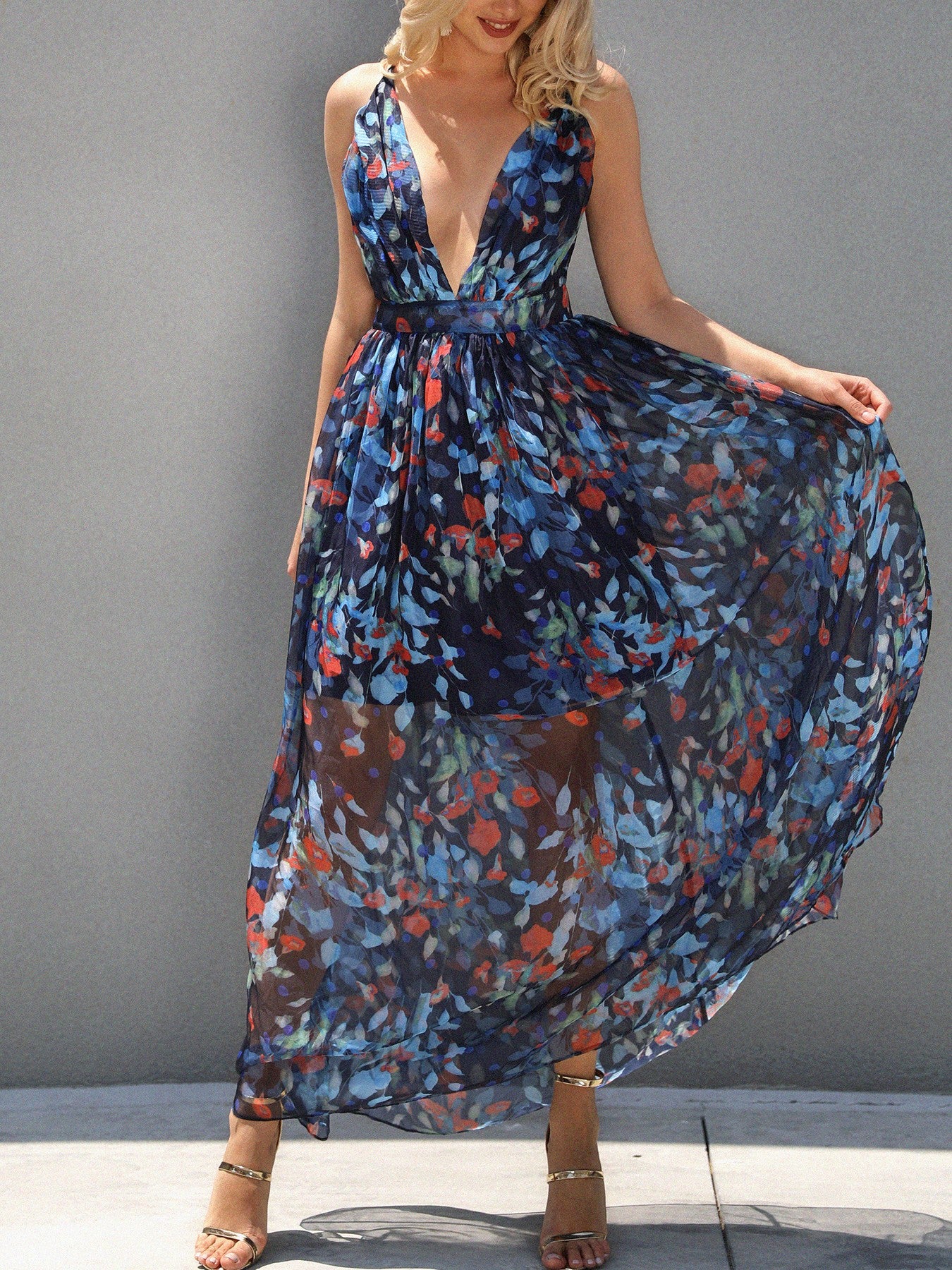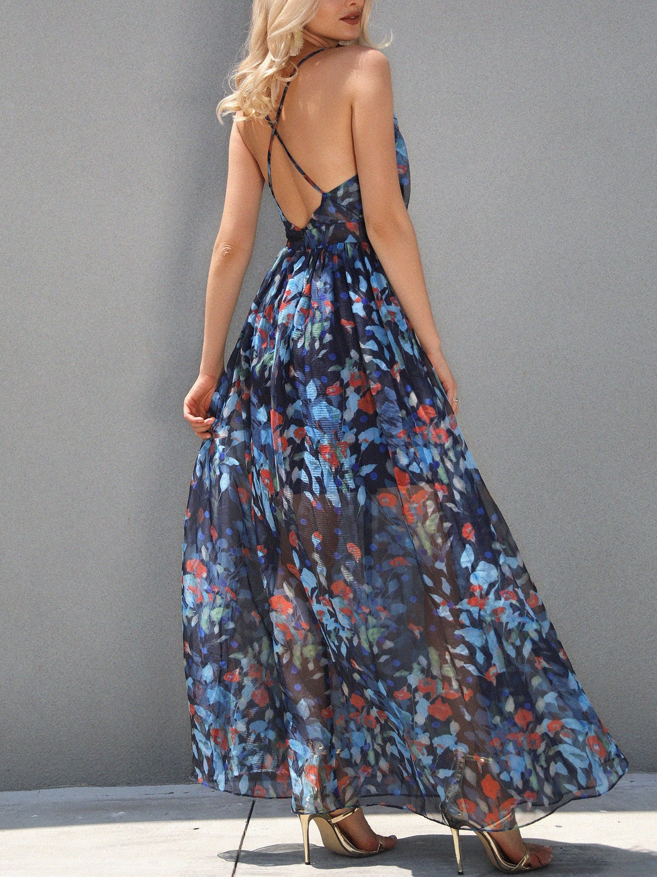 Floral Plunge Halter Crisscross Backless Maxi Dress