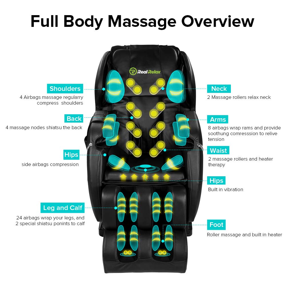 - Like expensive massage chairs, real relax one has features following: zero gravity design, heating function, vibration, full body airbag and foot roller .