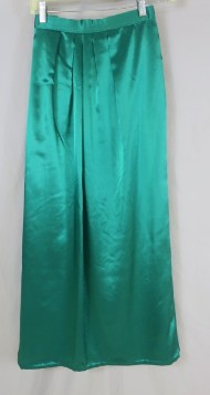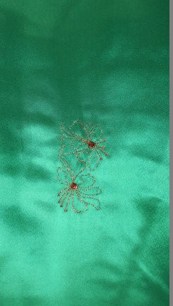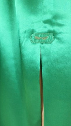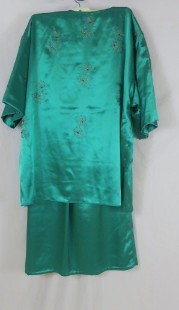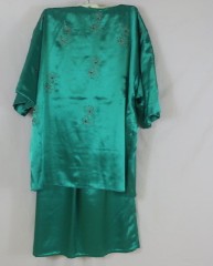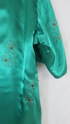 Green Satin 2 piece Skirt Tunic Set, Embroidered Red Flower Rhinestone detail Vintage 90's