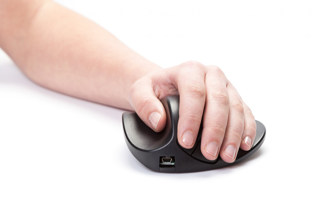 The design of the HandShoe mouse also reduces the effort required by the fingers to use the mouse buttons, which minimises stain from the fingers up to the neck.