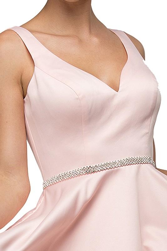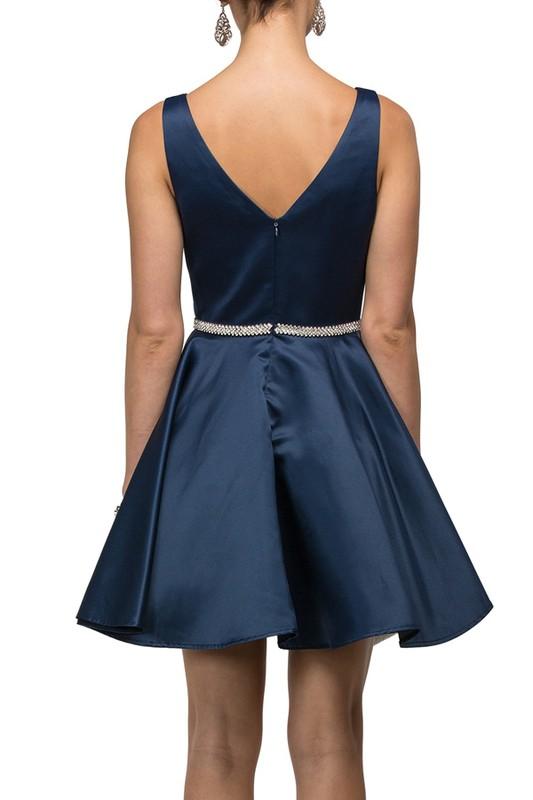 Dazzle the crowd at your homecoming event with this inexpensive short formal dress with dazzling beaded belt. A sleeveless v cut neckline all over satin homecoming dress with v cut back. This stunning formal dress features a fun and flirty flare satin short skirt. An outstanding value at less than $100.