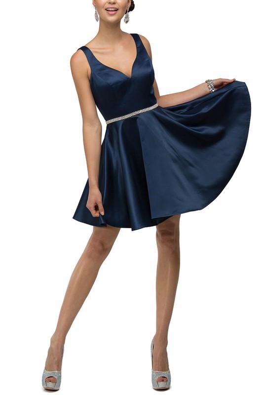 Step out in style at your homecoming event with this inexpensive short navy formal dress with dazzling beaded belt. A sleeveless v cut neckline all over satin homecoming dress with v cut back. This stunning formal dress features a fun and flirty flare satin short skirt. An outstanding value at less than $100.