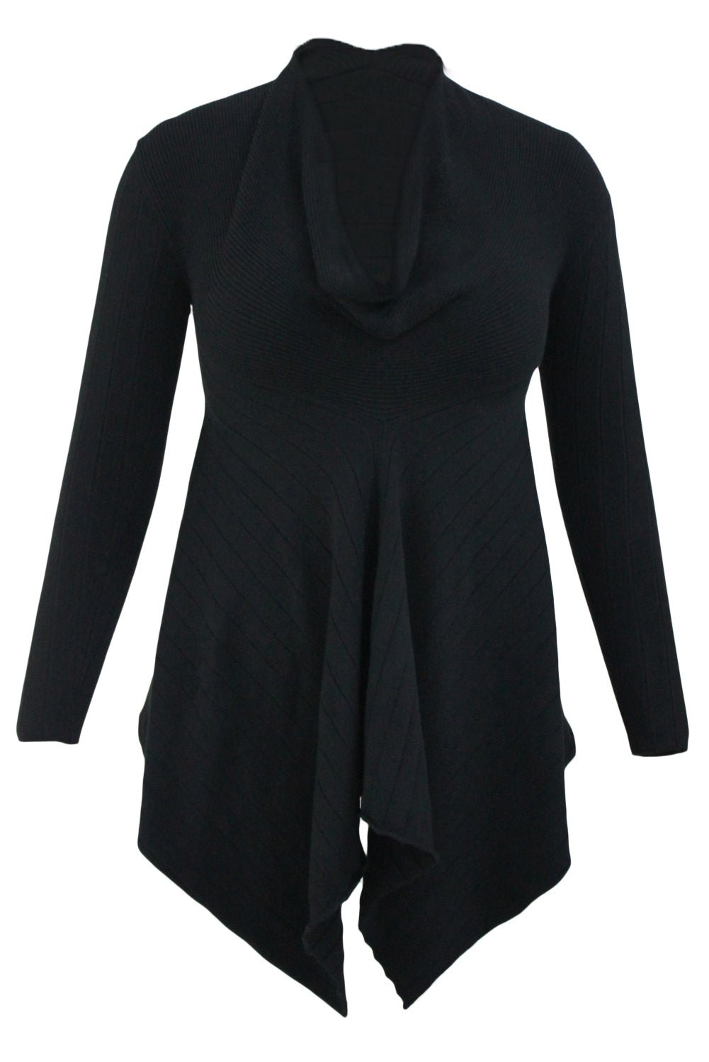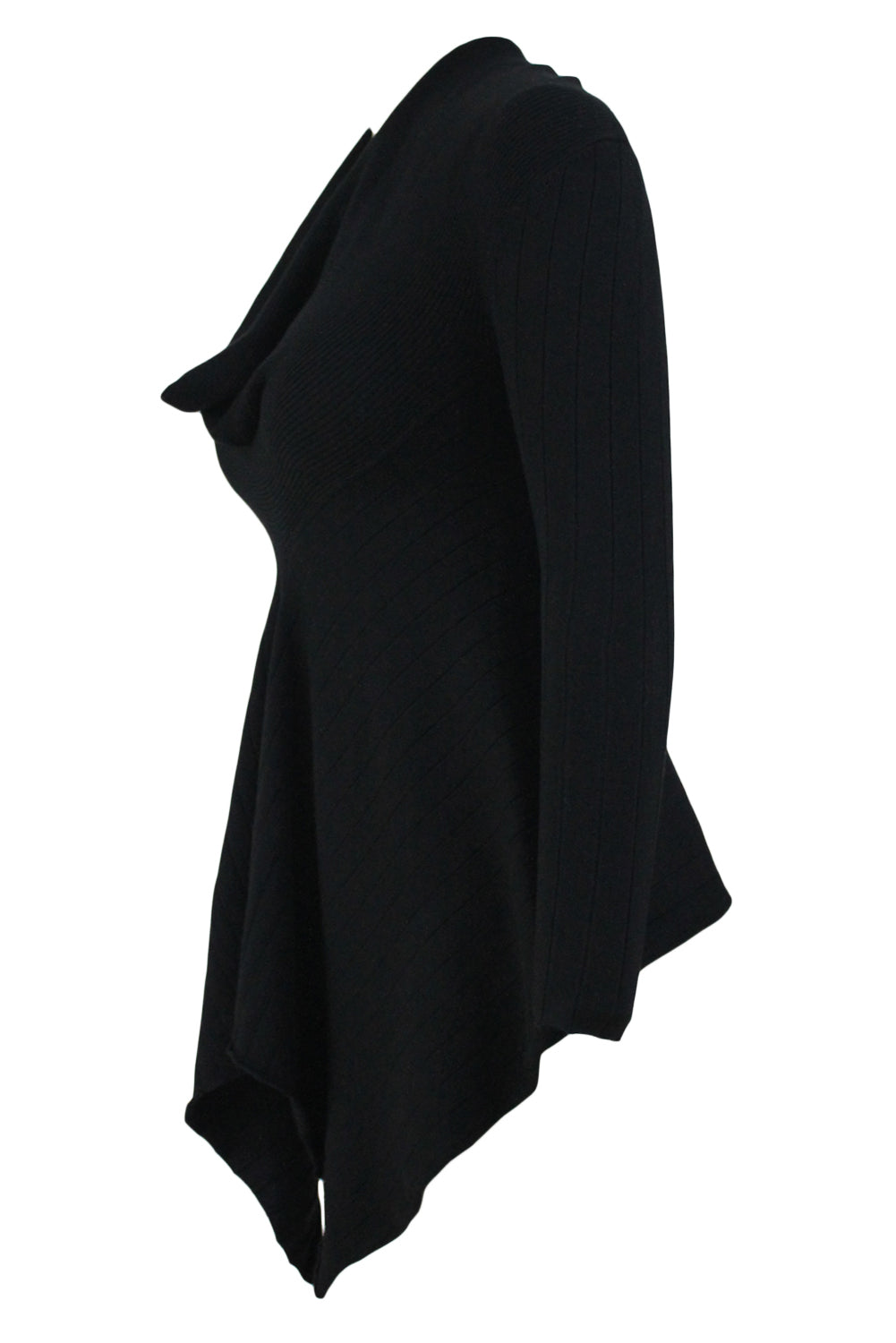 • Fit and flare silhouette with long sleeves, cowl neck and unique hemline