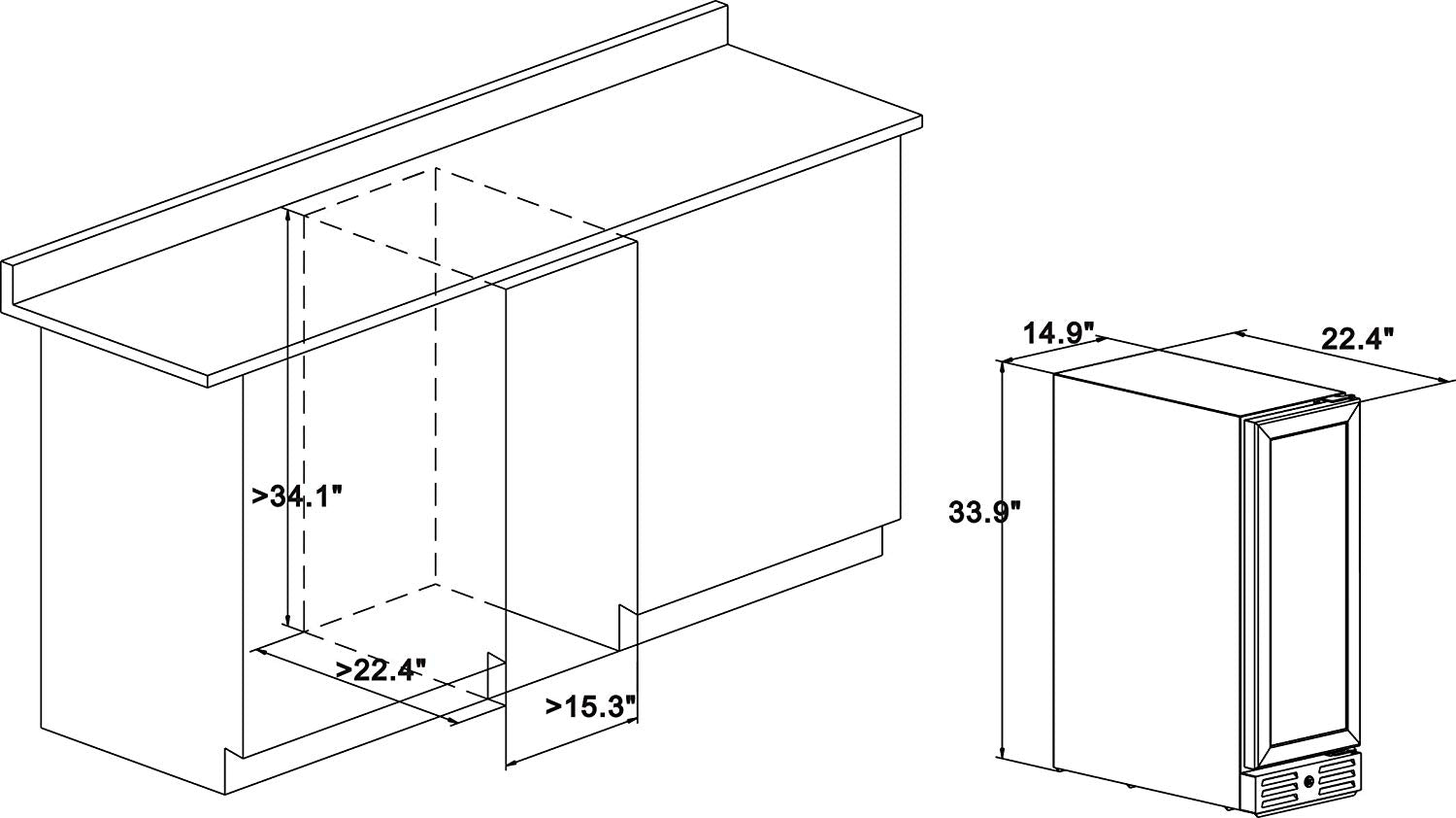 - VERSATILE INSTALLATION: Takes just 14.9 x 33.9 x 22.4 inches of space and can be installed under a counter in kitchen or bar area, or used as a freestanding unit!
