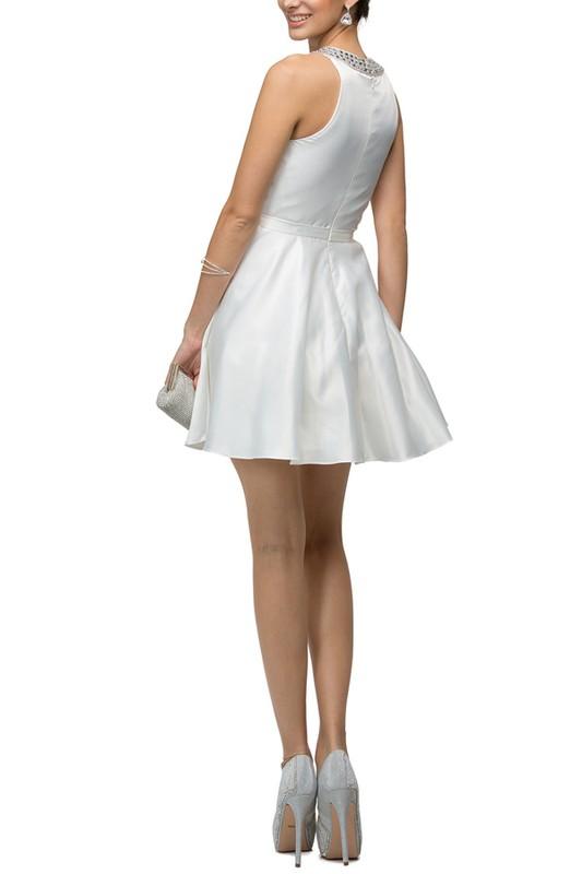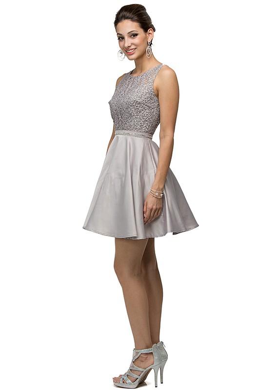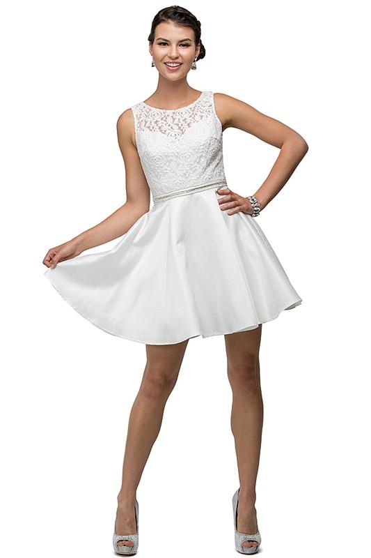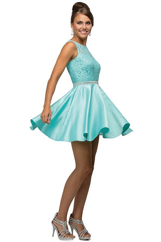 Rock this beautiful lace top plus size homecoming dress at your next formal event. A sleeveless lace top sheer sweetheart neckline bodice short homecoming dress accented with a sparkling beaded thin belt at the waist. This trendy plus size formal dress also features a flare satin skirt and a sexy key hole lace back.