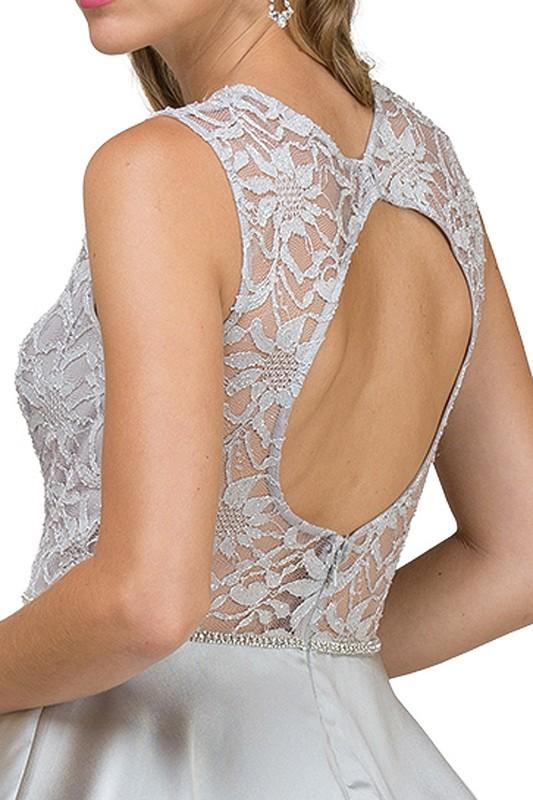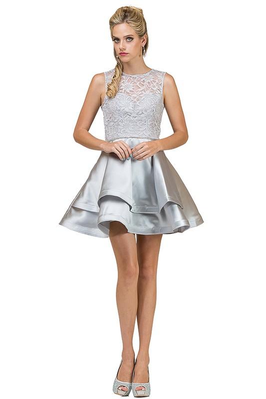 Be a homecoming queen with this years' hottest formal dresses. This beautiful lace top short white homecoming dress is the perfect choice. A sleeveless lace top sheer sweetheart neckline bodice short homecoming dress accented with a sparkling beaded thin belt at the waist. This trendy formal dress also features a two tiered flare satin skirt and a sexy key hole lace back. An outstanding value at less than $100.