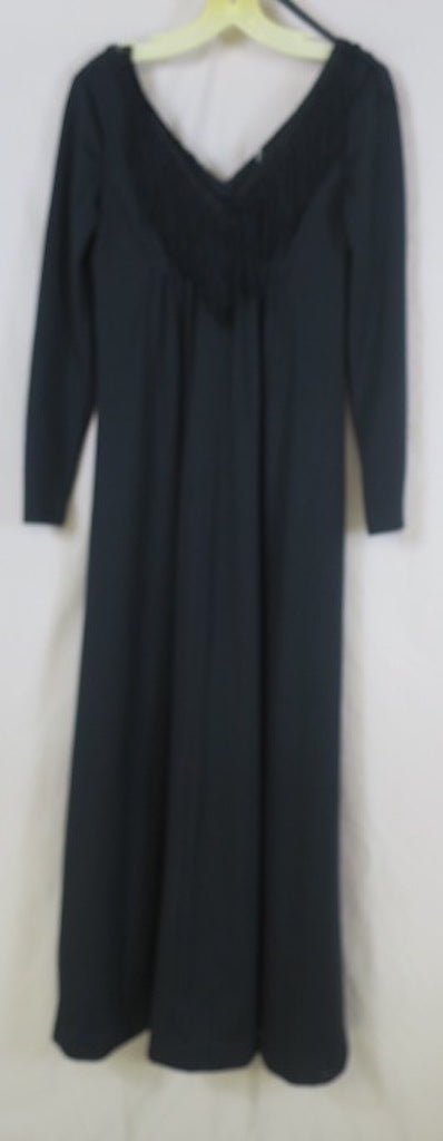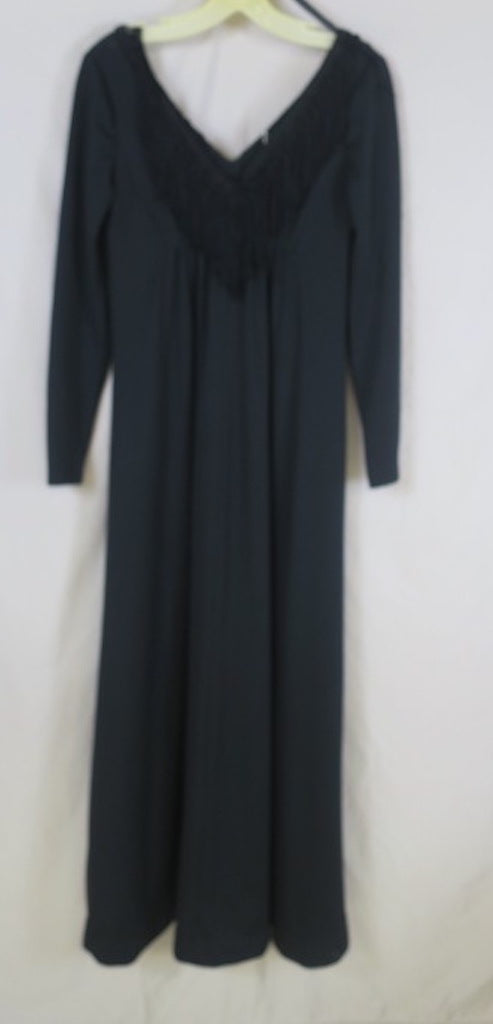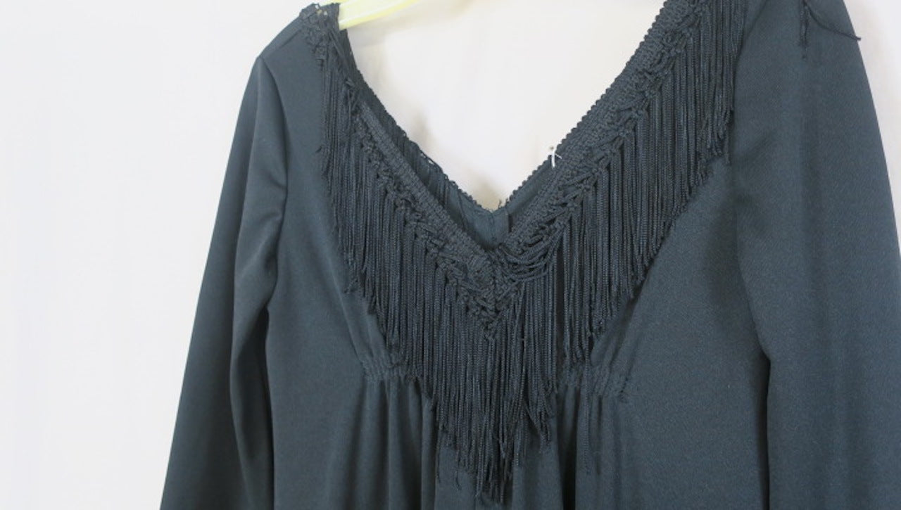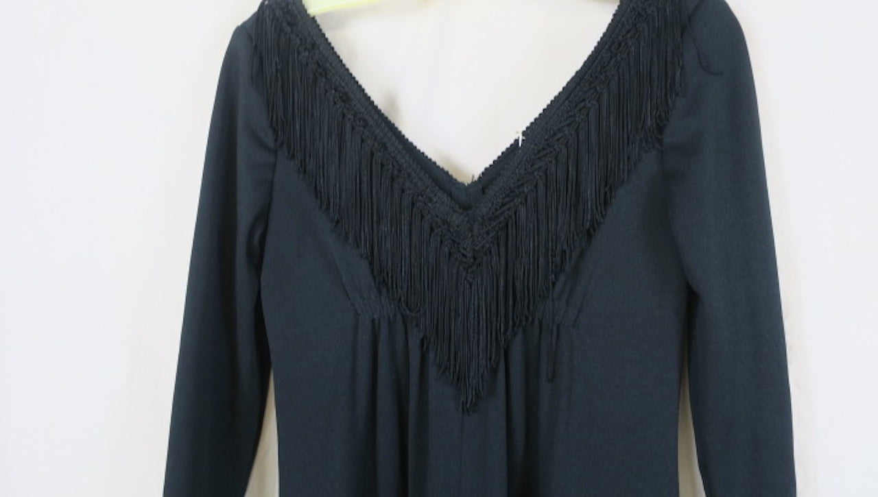 Long Black V-neck dress/gown with fringe accent, 70's Vintage