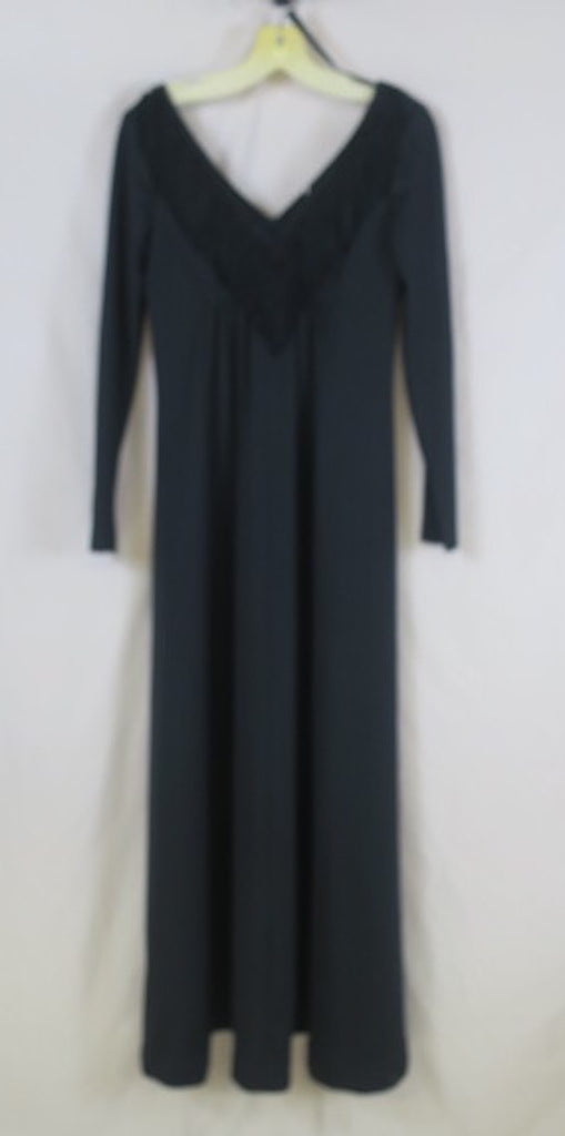 Long Black V-neck dress/gown with fringe accent, 70's Vintage. This vintage piece comes from a vintage store in upstate New York. The store closed and the inventory can be yours anywhere in the world! Measurements are listed when possible. If not, please ask and we will get back to you ASAP. This collection is stored away from my homebase, a 4 day handling time is listed, though it’s very possible it can ship within 24 hours. Please alert me if you need this item quickly! Each piece is final sale due to the unique nature of the garments, so be sure to ask anything you are unsure about.