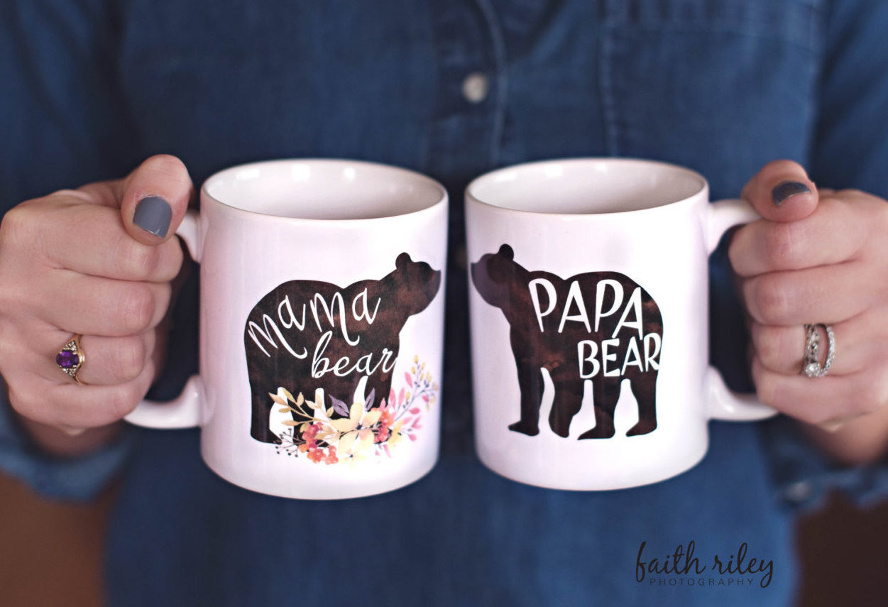 This listing is for a SET of 11oz or 15 oz white ceramic Coffee Mugs. You will receive 1 'mama bear' mug and 1 'papa bear' mug. These mugs can also be purchased separately, see shop for individual listings. Ships in 2-6 business days.