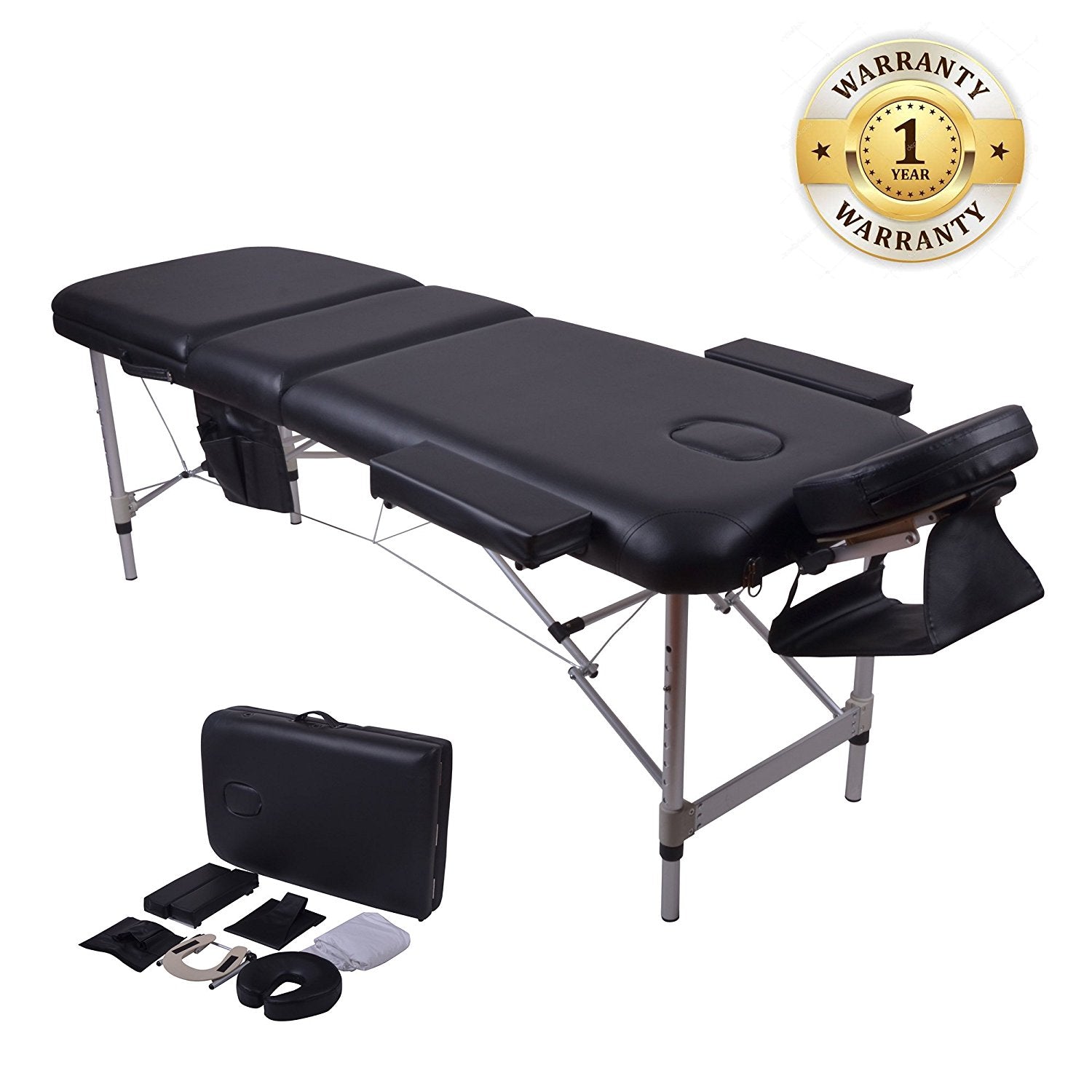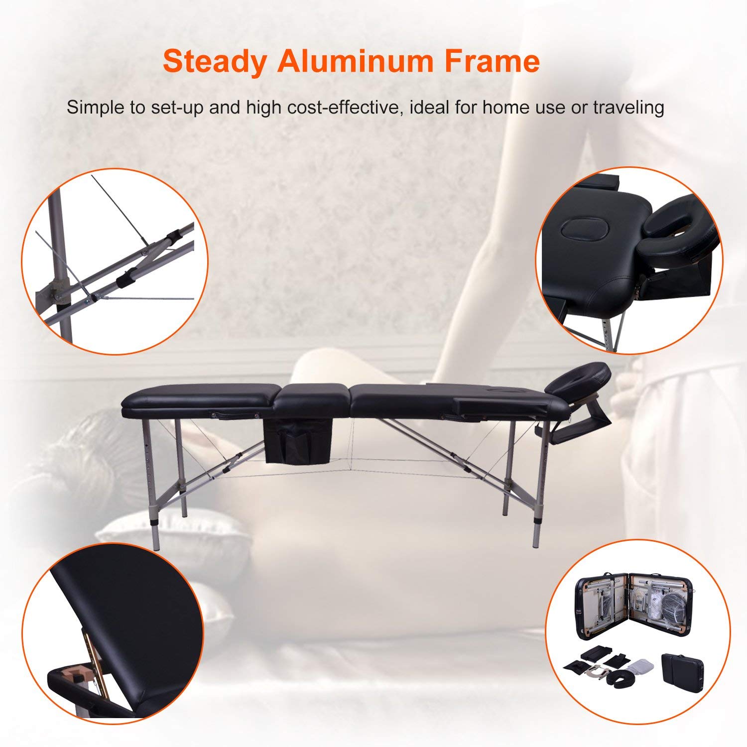 Massage Table Spa, 3 Section Adjustable Aluminum Leg Portable Massage Table with Carrying Bag and Additional Accessories, Black