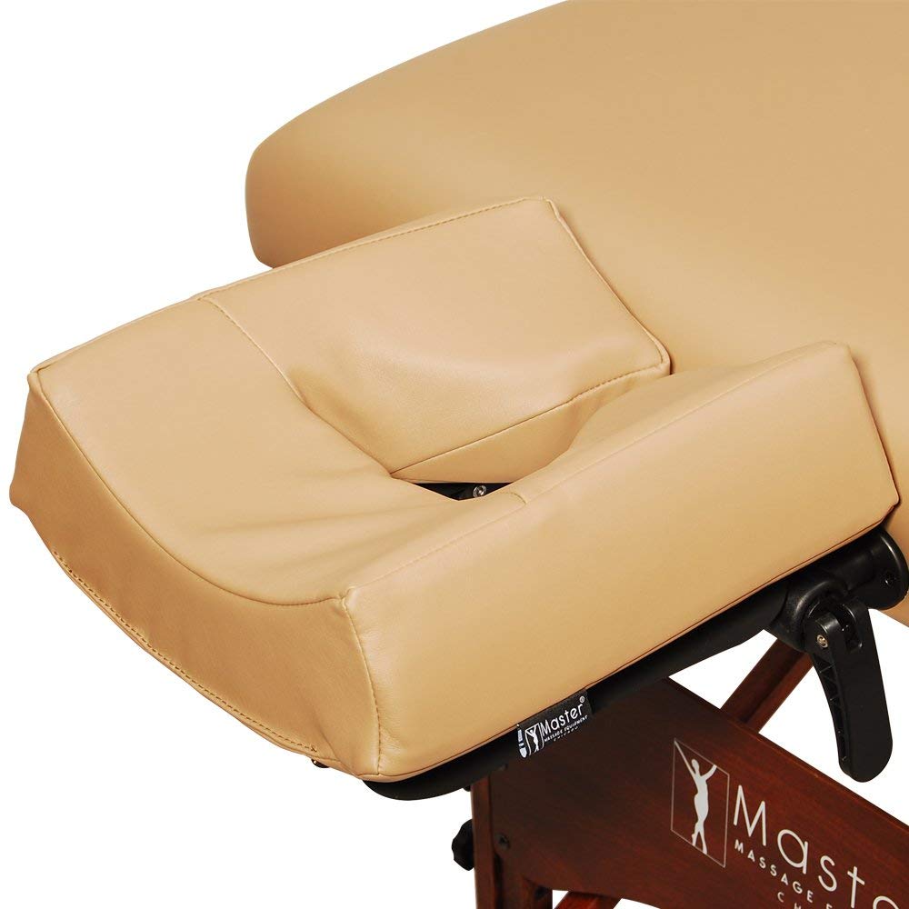 All materials in the table are formaldehyde and carcinogen free, and the PU upholstery in Cream color is oil- and water-resistant, CFC-free and reinforced with a denim like backing, for extra durability. The table easily supports a working weight of 750lbs., thanks to the table's Duo-Plane hinges, stabilizer bar and Clevis Block leg attachments. Master Massage includes in this package adjustable face cradle, memory foam face pillow designed to release pressure points, and 2-pocket carrying case.