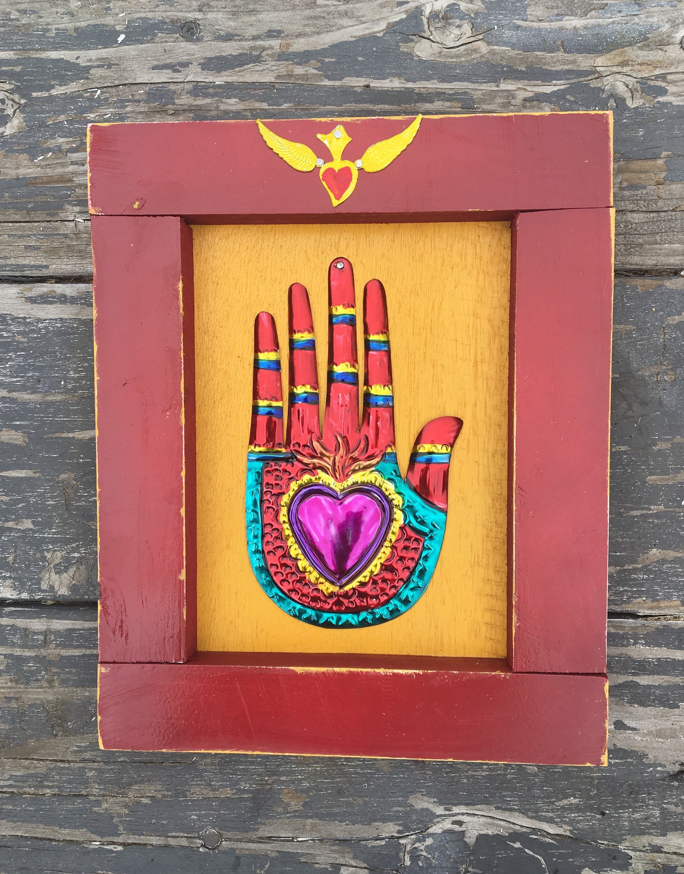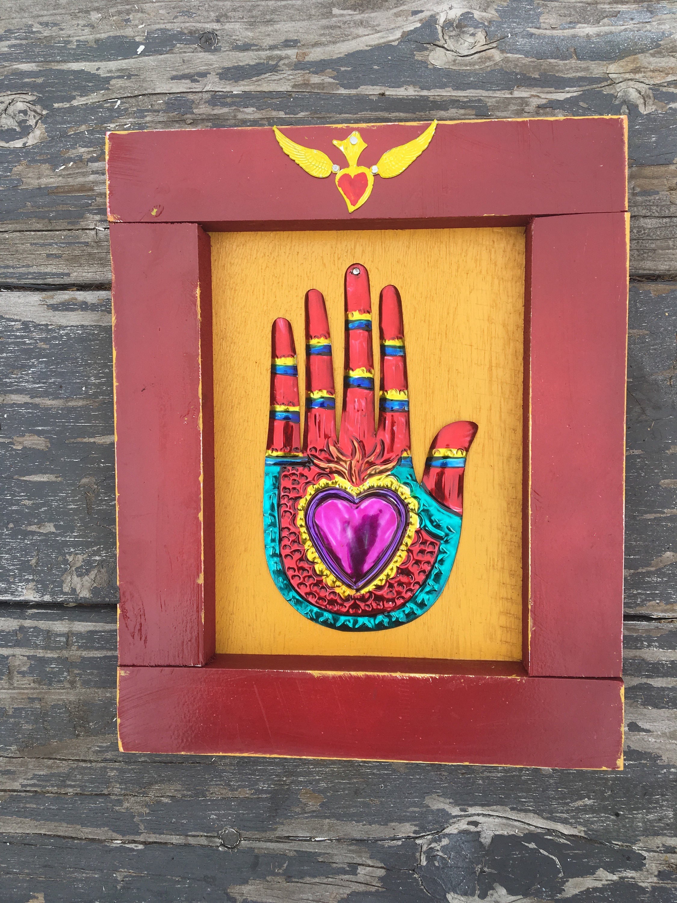 Serene looking Tin Heart in Hand Milagro on beautifully painted wooden surface. The wooden board is crafted from recycled wood and carefully painted on. Central, aluminum Milagro generates an aura of love and protection.