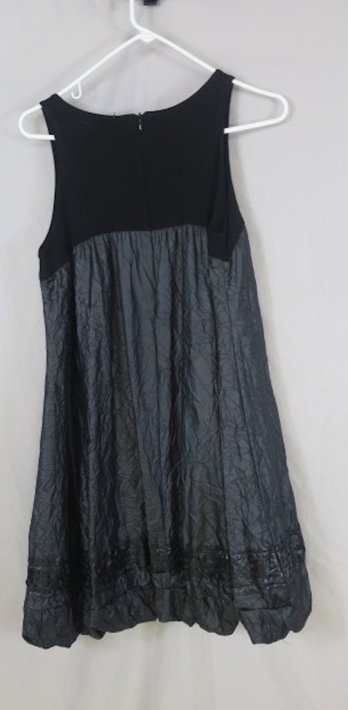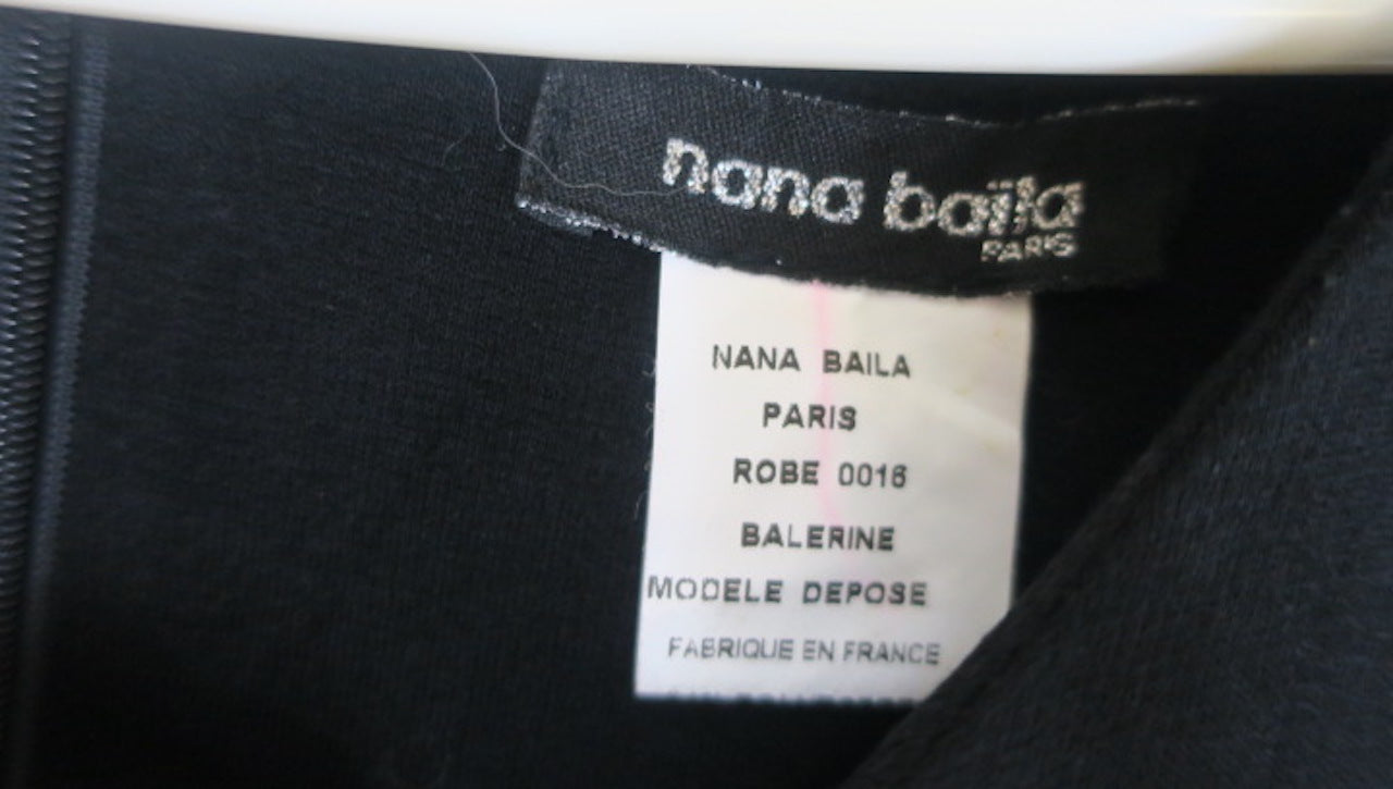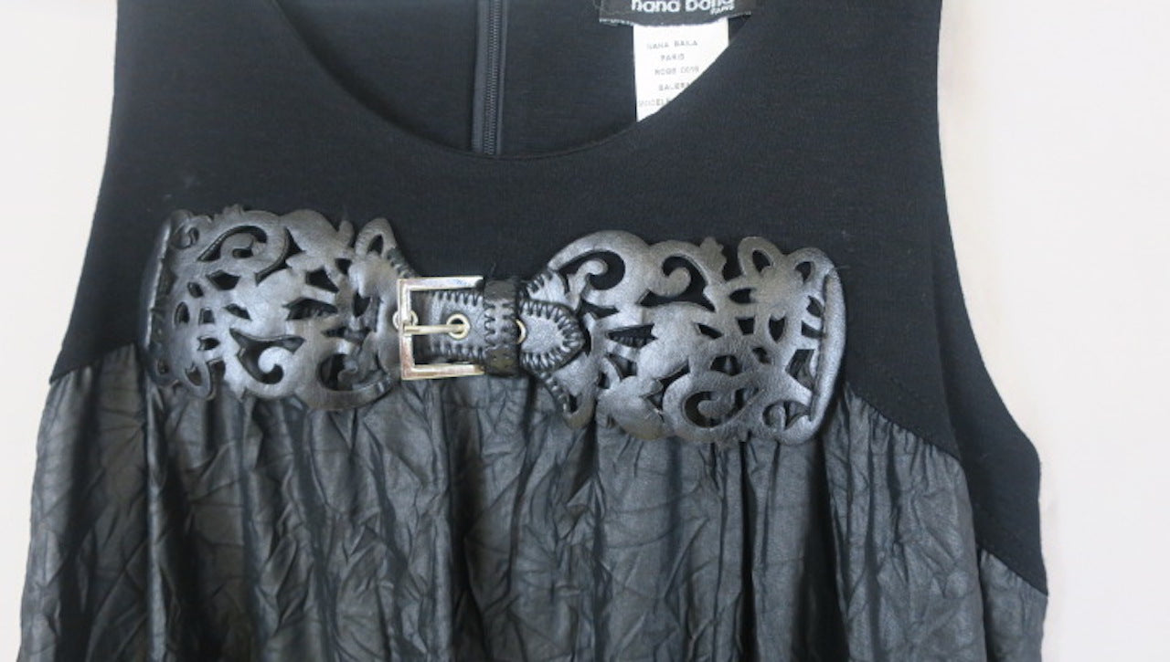 Nana Baila Paris Vintage French Designer mini party dress, 90's black Leather cutout belt accent, hem accent, small