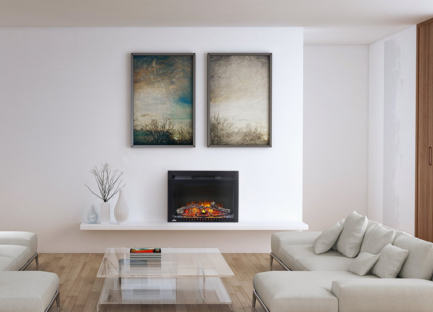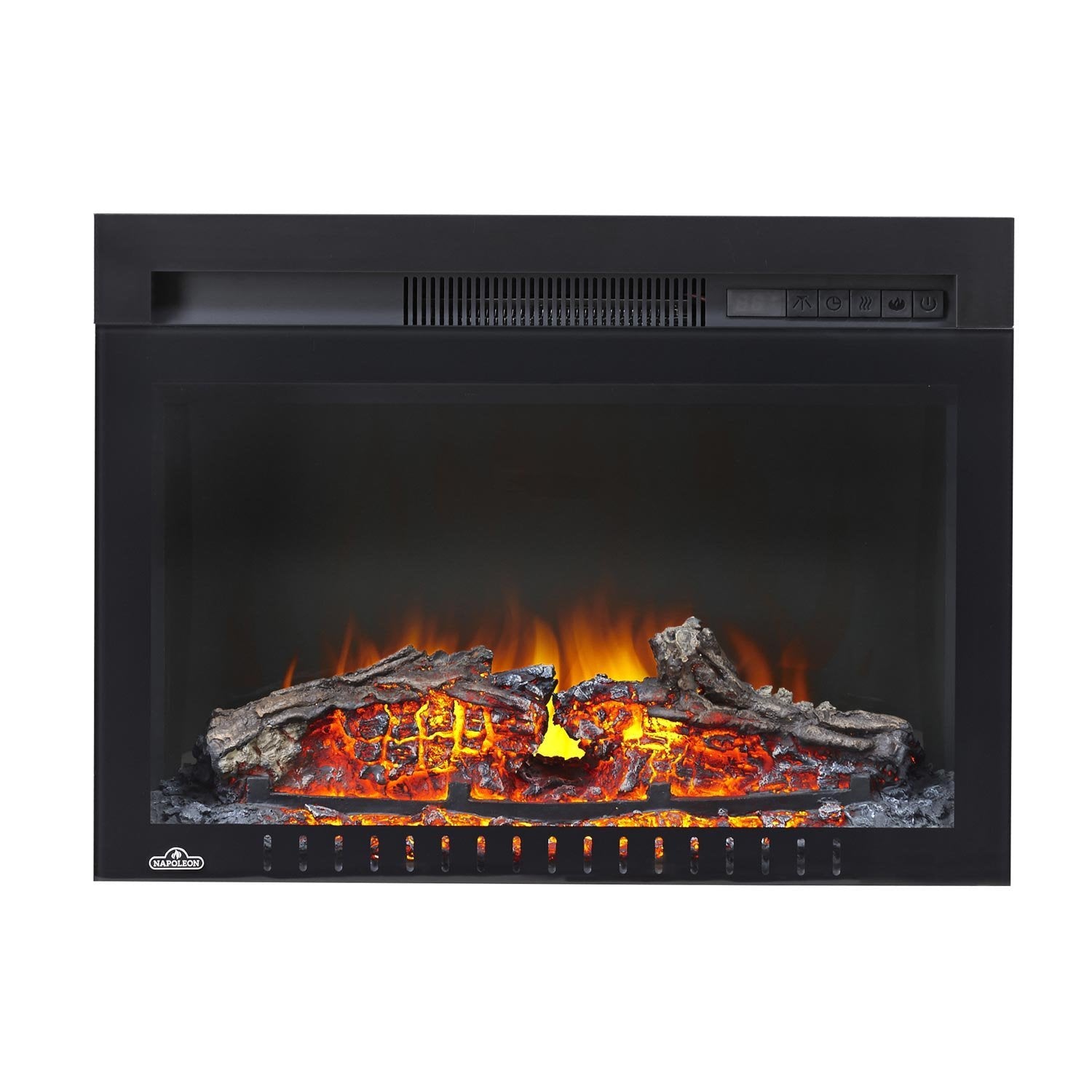 The Napoleon Cinema Log 24 Electric Fireplace creates an inviting space with 5,000 BTU's of warmth and no need for venting. Plug in and enjoy this fireplace right away and create a rich focal point in your space. The realistic log bed glows just like real burning logs, and when you turn the fireplace off, fade just like a dying fire. Fully customize your electric fireplace with adjustable flame brightness and heat intensity to perfectly set the mood, no matter where you put it. Perfect for a built-in installation or can also be ordered with the Essential mantel package option for a functional and beaujpgul piece of decor. Features: Up to 5,000 BTU's. 1,500 Watts. Timer for up to six hours. Convenient remote control. Can be Plugged in or Hardwired 120V. Adjustable Flame and Ember Light Control. Temperature control through four heat settings. Realistic molded logset slowly die out when turned off for an authentic fireplace experience. Specifications: Glass Size: 21" (W) x 11.63" (H). Framing Dimensions: 23" (W) x 9" (D) x 17.25" (H). Overall Dimensions: 24" (W) x 8.63" (D) x 17.63" (H).