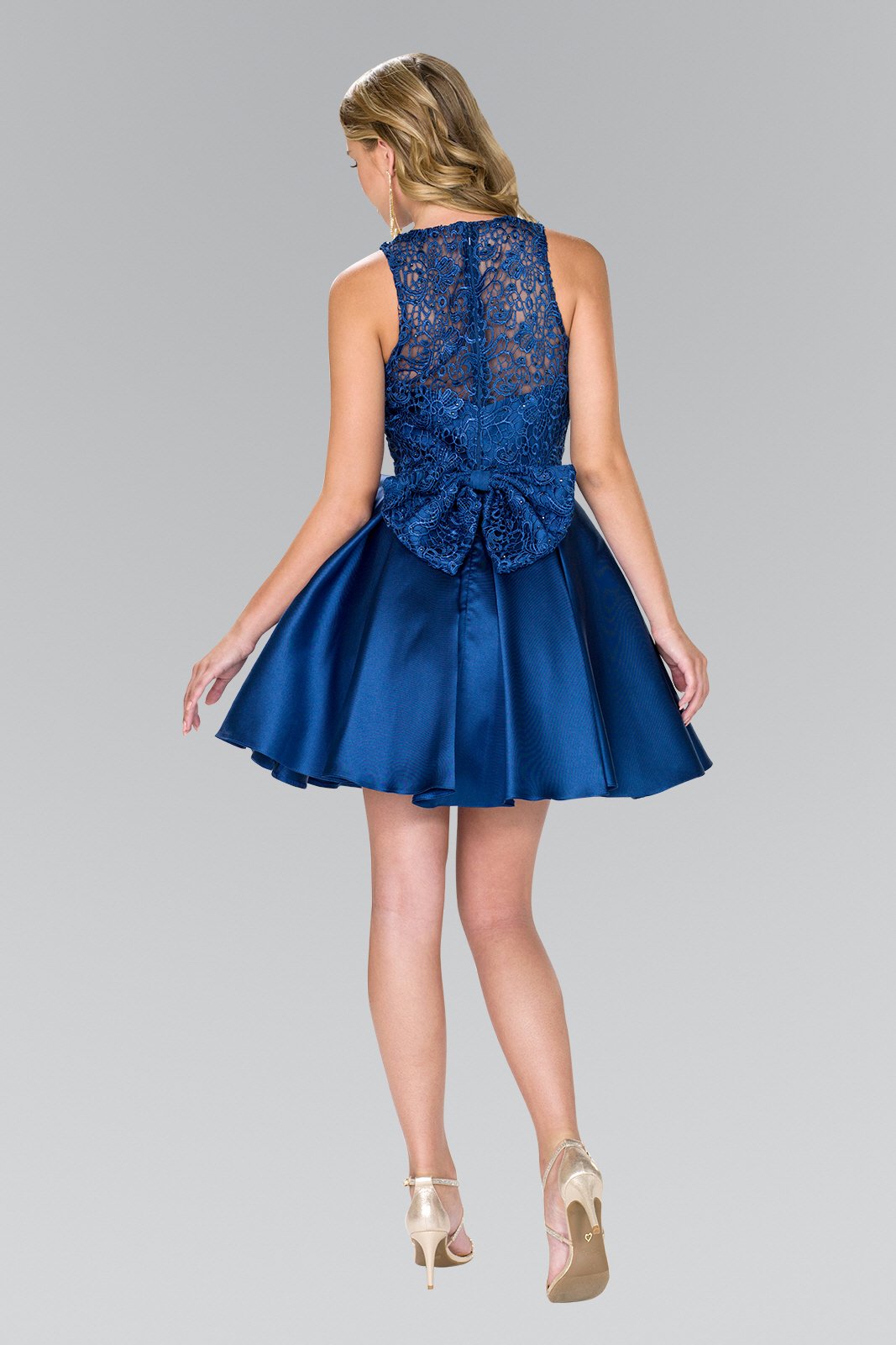 Be the bell of the ball at your next formal event with this trendy navy lace top short satin homecoming dress. A sleeveless scoop neckline lace bodice formal dress accented with trendy bow at the back. This lovely short homecoming dress also features a flowing pleated satin skirt.