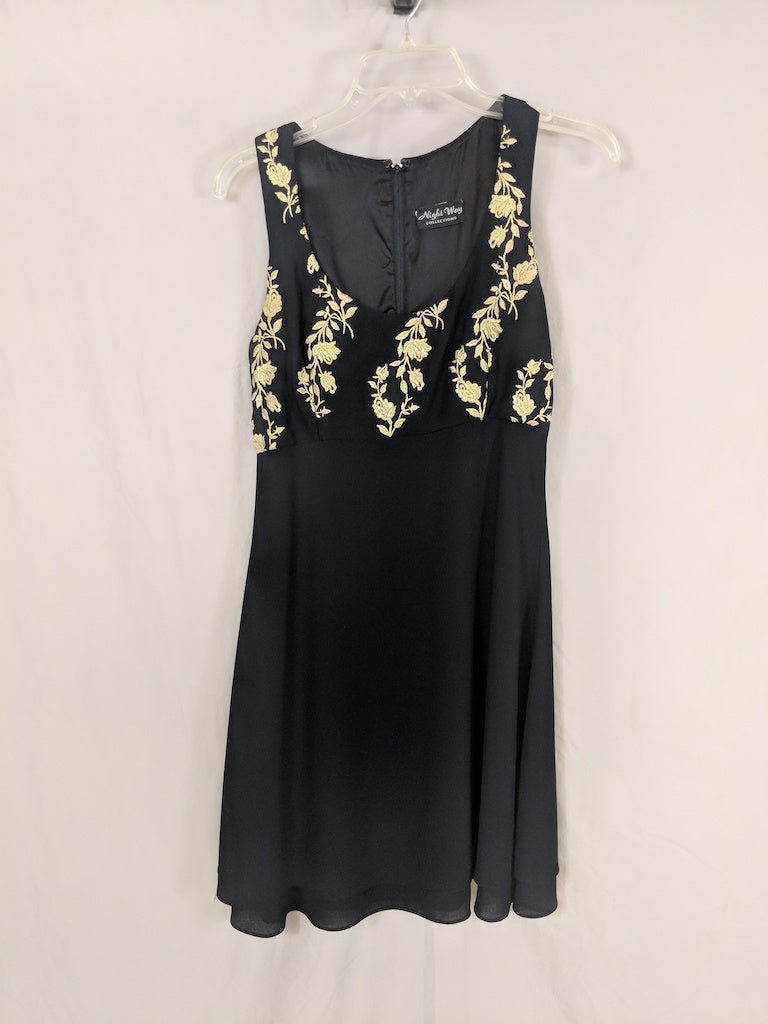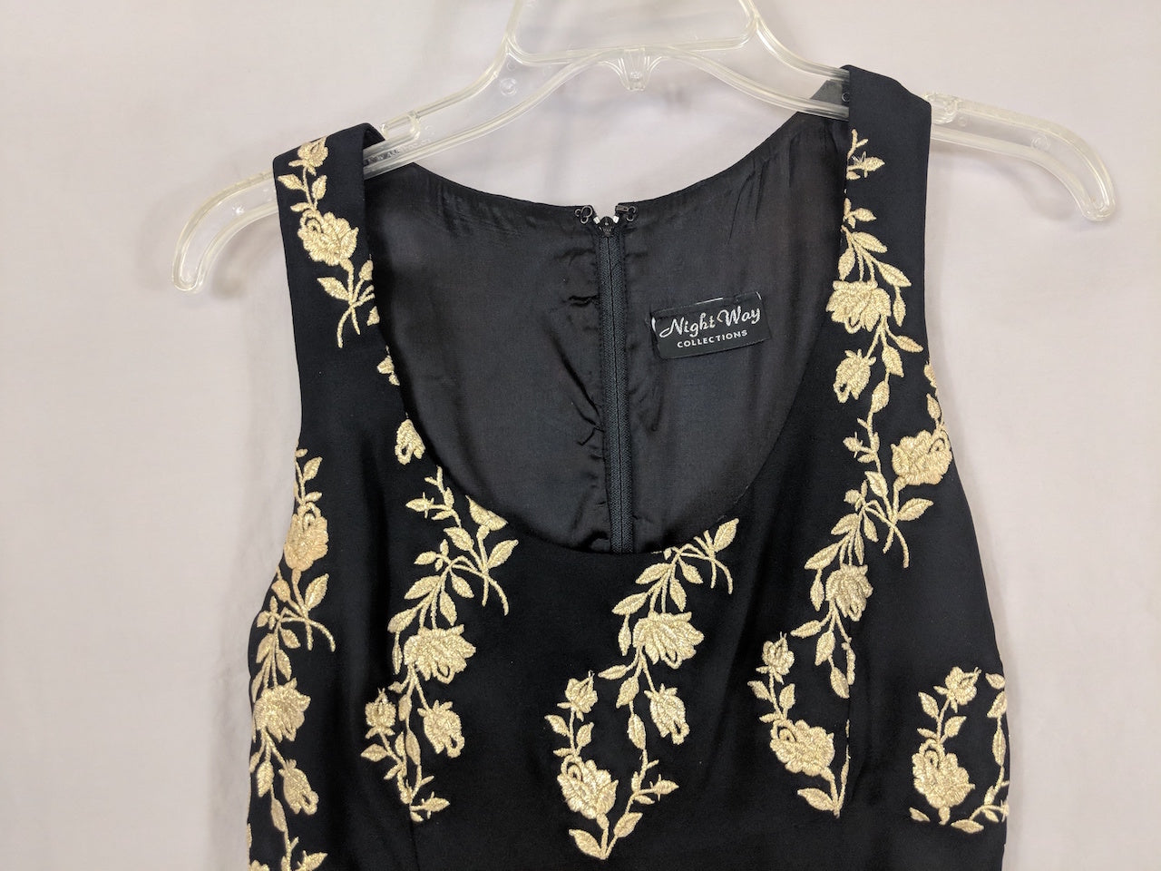 Night Way Collection black and gold embroidered floral bodice, empire waist, flowly flare skirt 90's prom party dress