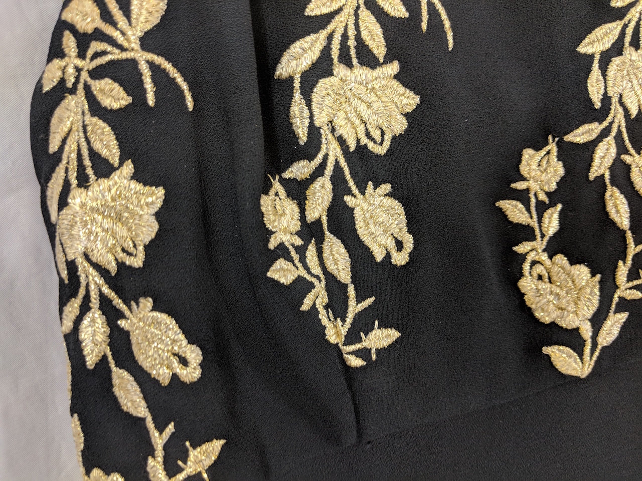 Night Way Collection black and gold embroidered floral bodice, empire waist, flowly flare skirt 90's prom party dress. This vintage piece comes from a vintage store in upstate New York. The store closed and the inventory can be yours anywhere in the world! Measurements are listed when possible. If not, please ask and we will get back to you ASAP. This collection is stored away from my homebase, a 4 day handling time is listed, though it’s very possible it can ship within 24 hours. Please alert me if you need this item quickly! Each piece is final sale due to the unique nature of the garments, so be sure to ask anything you are unsure about.
