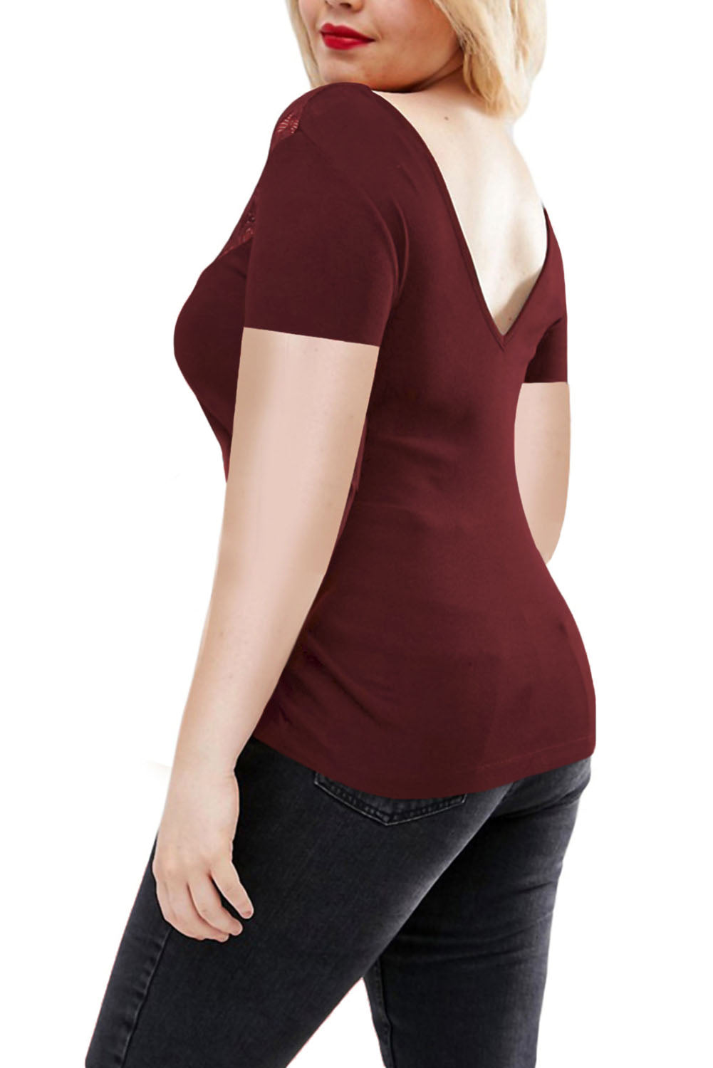 Graciously accept the compliments you'll receive as you wear this luxuriously soft jersey top. This directional staple tee draws the eye to the subtly sexy neckline and the artful lace splicing design. The short sleeves and modest neckline allows for the most comfortable coverage. Pair with your favorite pair of jeggings and ankle boots for a contemporary work look.