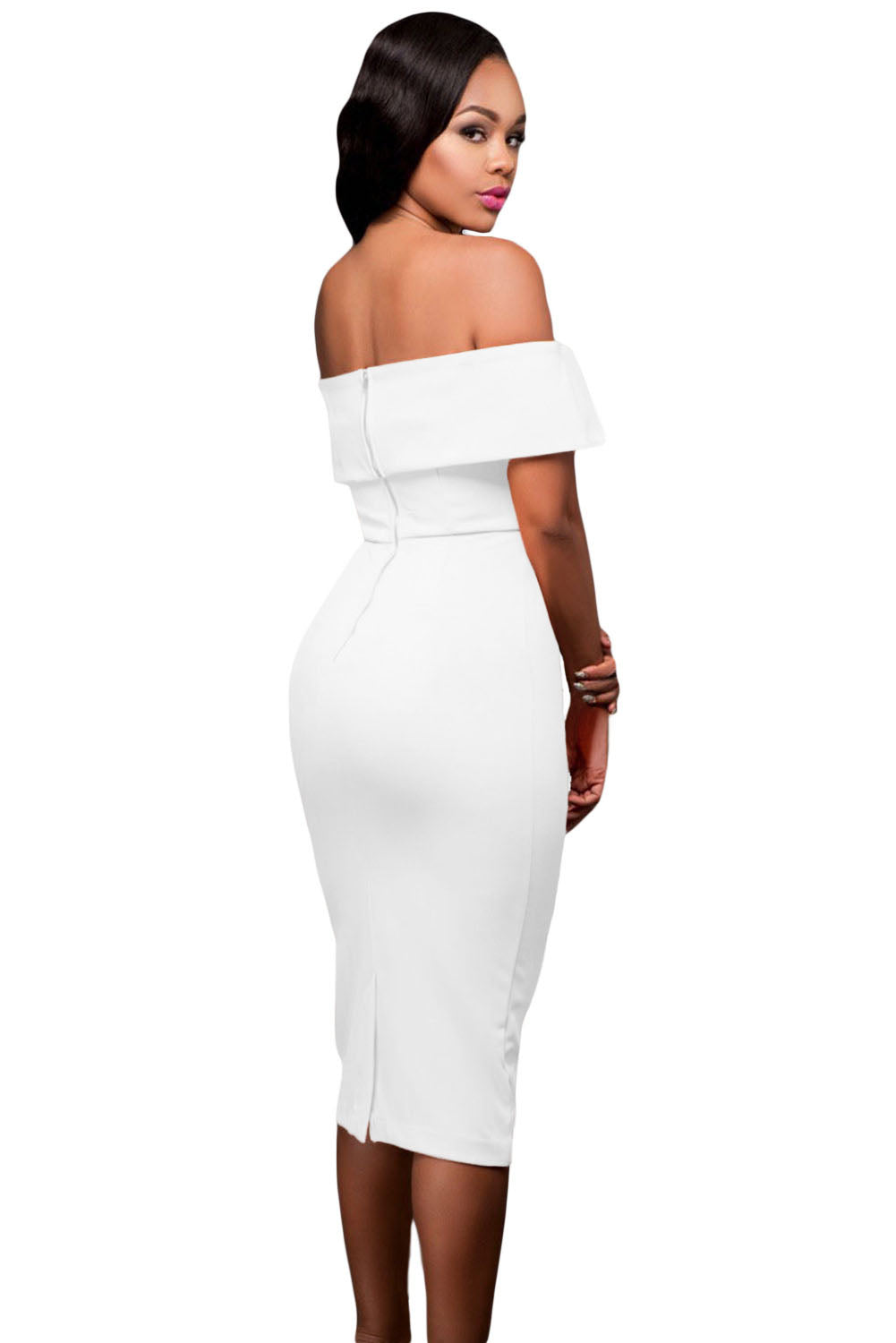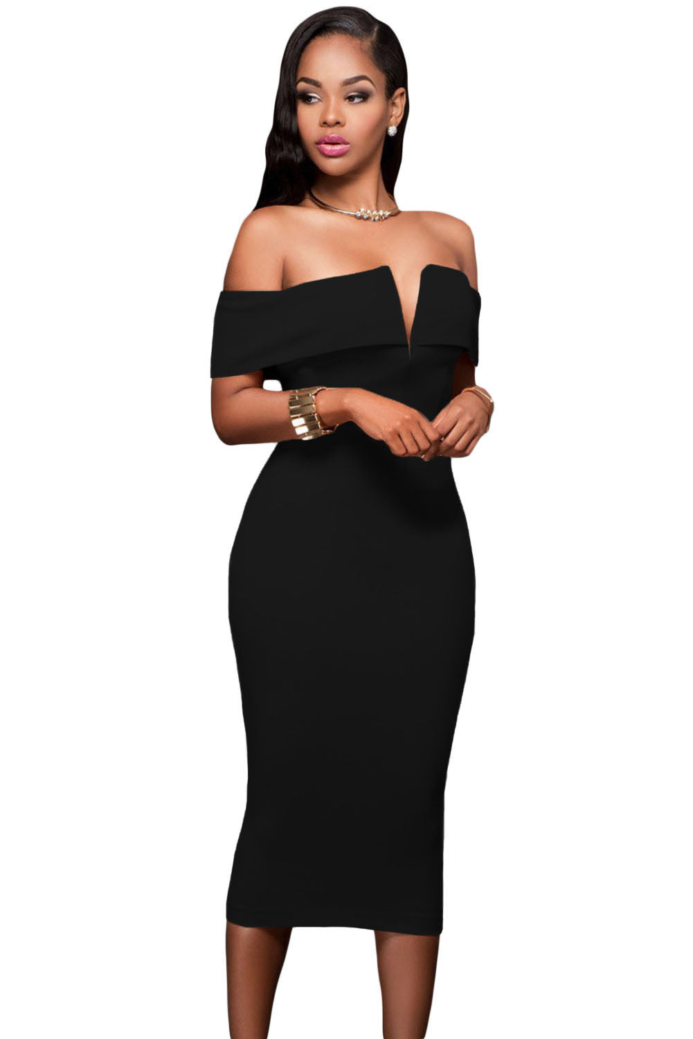 No matter the occasion, this chic dress is the answer. Featuring an off-the-shoulder neckline with V cut, padded bust and flattering midi silhouette in a curve-hugging fit, back slit for convenient wear, it's an essential you'll wear again and again. Center back zipper closure finished.