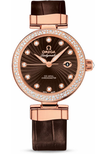 34 mm 18K red gold case with diamond waves on the case sides, transparent back, screw-in crown, snow-set diamond paved bezel, domed scratch-resistant sapphire crystal with anti-reflective treatment on both sides, brown dial with diamond hour markers, self-winding chronometer Omega 8521 movement with Co-Axial Escapement and date, approximately 50 hours of power reserve, brown leather strap. Water resistant to 100 m.