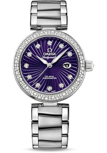 34 mm stainless steel case, transparent back, screw-in crown, Snow-set diamond bezel, domed scratch-resistant sapphire crystal with anti-reflective treatment on both sides, purple supernova dial with diamond hour markers, self-winding chronometer Omega 8520 movement with Co-Axial Escapement and date, approximately 50 hours of power reserve, stainless steel bracelet. Water resistant to 100 m.