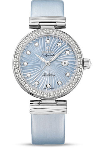 34 mm stainless steel case, transparent back, screw-in crown, Snow-set diamond bezel, domed scratch-resistant sapphire crystal with anti-reflective treatment on both sides, blue mother-of-pearl supernova dial with diamond hour markers, self-winding chronometer Omega 8520 movement with Co-Axial Escapement and date, approximately 50 hours of power reserve, light blue leather strap. Water resistant to 100 m.
