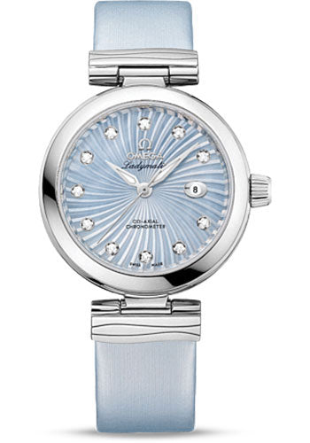 34 mm stainless steel case, transparent back, screw-in crown, domed scratch-resistant sapphire crystal with anti-reflective treatment on both sides, blue mother-of-pearl supernova dial with diamond hour markers, self-winding chronometer Omega 8520 movement with Co-Axial Escapement and date, approximately 50 hours of power reserve, light blue leather strap. Water resistant to 100 m.