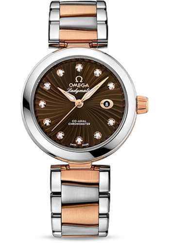 34 mm stainless steel and 18K red gold case, transparent back, screw-in crown, domed scratch-resistant sapphire crystal with anti-reflective treatment on both sides, brown supernova dial with diamond hour markers, self-winding chronometer Omega 8520 movement with Co-Axial Escapement and date, approximately 50 hours of power reserve, stainless steel and 18K red gold bracelet. Water resistant to 100 m.