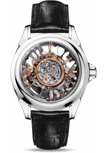 38.7 mm platinum case, transparent back, domed anti-reflective scratch-resistant sapphire crystal with anti-reflective treatment both sides, transparent dial, self-winding chronometer Omega 2636 movement with Co-Axial Escapement Tourbillon, approximately 45 hours of power reserve, black leather strap. Water resistant to 30 m.