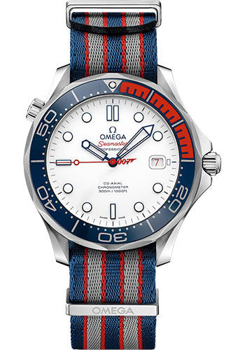 41 mm stainless steel case with helium escape valve, transparent screw-in back with wave-pattern and engraved with Commander’s Watch - Limited Edition and the limited edition number, screw-in crown, unidirectional rotating blue and red ceramic bezel with Liquidmetal diving scale, domed scratch-resistant sapphire crystal with anti-reflective treatment on both sides, polished white ceramic dial with facetted blued skeleton hour-minute hands and varnished red second hand with 007 gun logo counterweight, caliber Omega 2507 self-winding Co-Axial chronometer movement , rotor with 9mm bullet and decorative plate bearing the 007 and OMEGA logo and Calibre number, approximately 48 hours of power reserve, 5-stripe blue and red and grey polyamide Nato strap. Water resistant to 300 m (1000 ft).