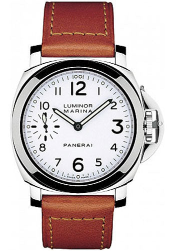 44mm AISI 316L polished steel case, see-through sapphire crystal back, brushed steel device protecting the crown, white dial with luminous Arabic numerals and markers and seconds at 9 o'clock, hand-wound Panerai OP XI calibre movement with hours, minutes, small seconds, approximately 56 hours of power reserve, brown leather strap. Water resistant to 300 meters.