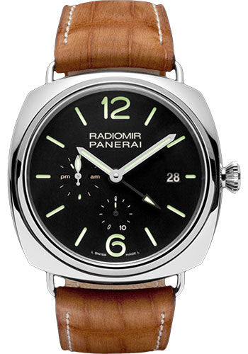 47mm AISI 316L polished steel case with removable wire loop strap attachments, see-through sapphire crystal back, polished bezel, screw-down crown, black dial with luminous Arabic numerals and hour markers, date at 3 o’clock, seconds and 24h indicator at 9 o’clock, circular power reserve indicator at 6 o’clock, automatic Panerai P.2003/6 calibre movement with hours, minutes, small seconds, date, second time zone, 24h indicator, circular power reserve indicator, seconds reset, approximately 10 days of power reserve, brown alligator strap. Water resistant to 100 meters.