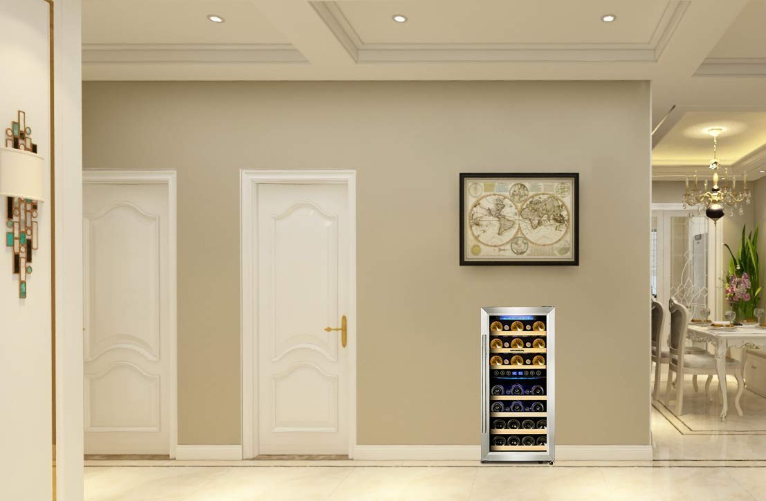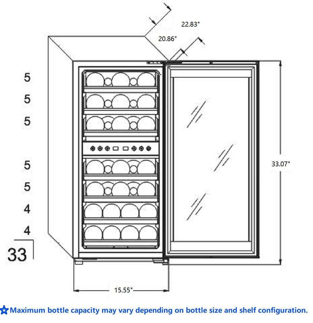FOR PERSONAL & PROFESSIONAL USE: Combining a sleek craftsmanship, easy to grip handles and ergonomic design this wine fridge is ideal for personal and professional use. Great for home, mini bars, hotels, office, kitchen counter, in the wine cellar used as a freestanding unit. It only takes W 15.5 x H 33.1 x D 22.8 inches of your space.