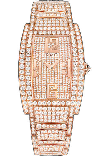 27 x 38 mm 18K rose gold case set with 86 brilliant-cut diamonds (approx. 1.8 ct), 7.4 mm thick, diamond crown set with a brilliant-cut diamond (approx. 0.1 ct), diamond bezel, gem set dial set with 293 brilliant-cut diamonds (approx. 0.9 ct) with hour-markers in 18K rose gold, 690P quartz movement, 18K rose gold bracelet set with 600 brilliant-cut diamonds (approx. 7.1 ct), integrated buckle. Water resistant to 03 ATM.