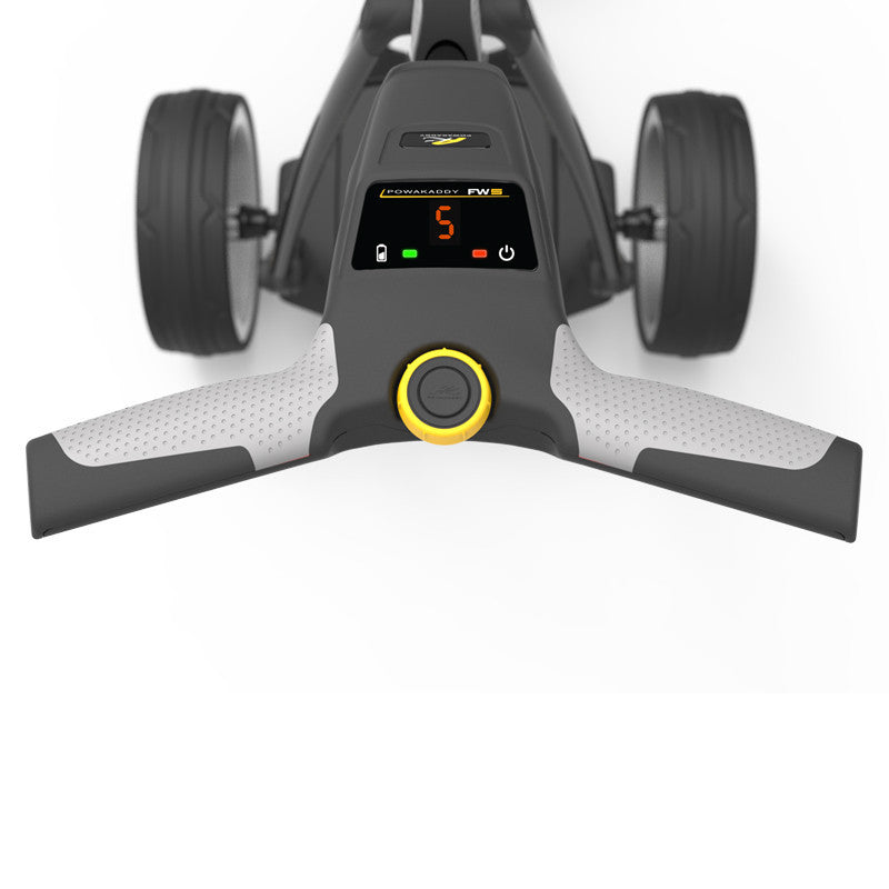 The new 2016 PowaKaddy FW5 builds on the superior performance of the Freeway range with a number of technological advancements including; a Digital Power Gauge and Battery Fuel Indicator, an Integrated USB charging port, powerful whisper quiet 200 watt motor, 2 warranty and ‘ADF’ (Automatic Distance Function) feature which allows you to send your trolley to the next hole with pre-set distances of 15, 30 and 45 yards.