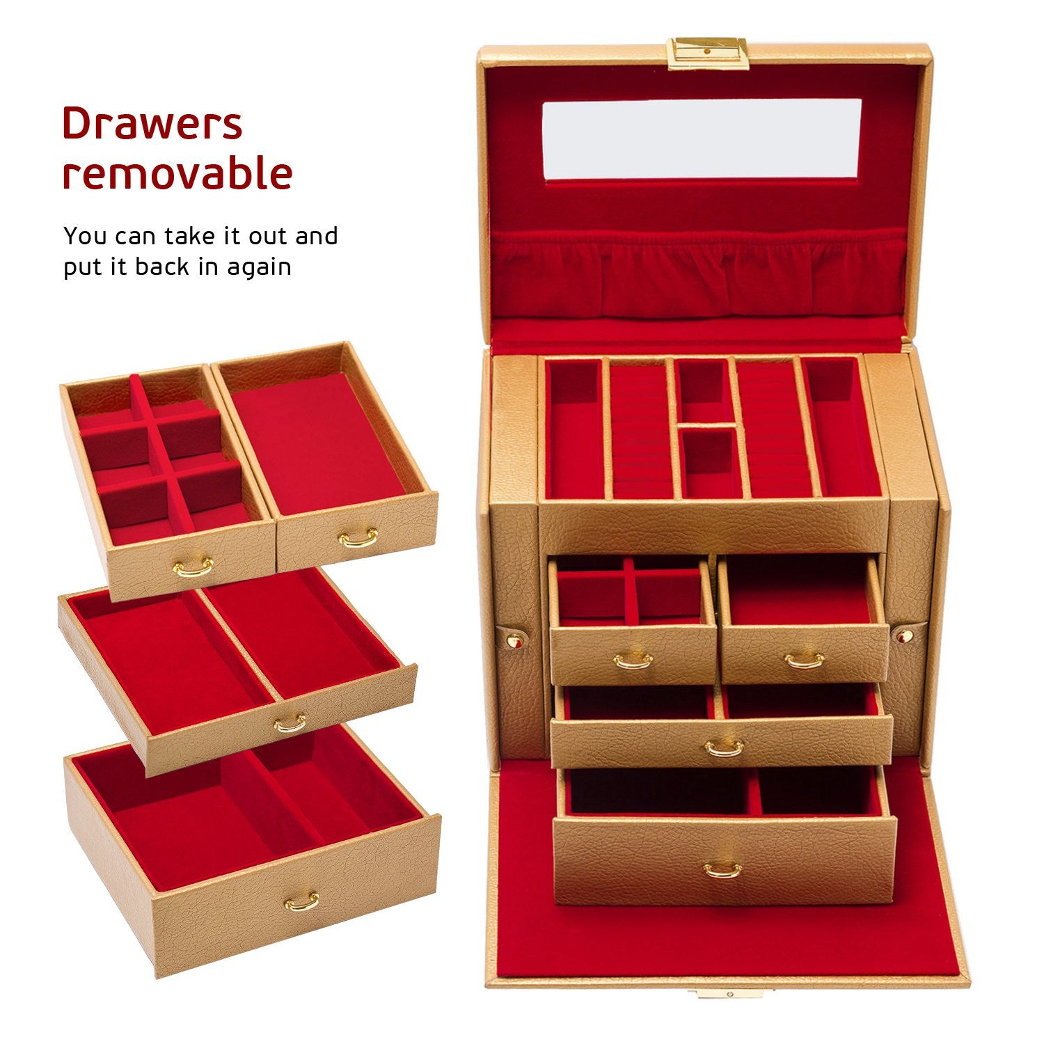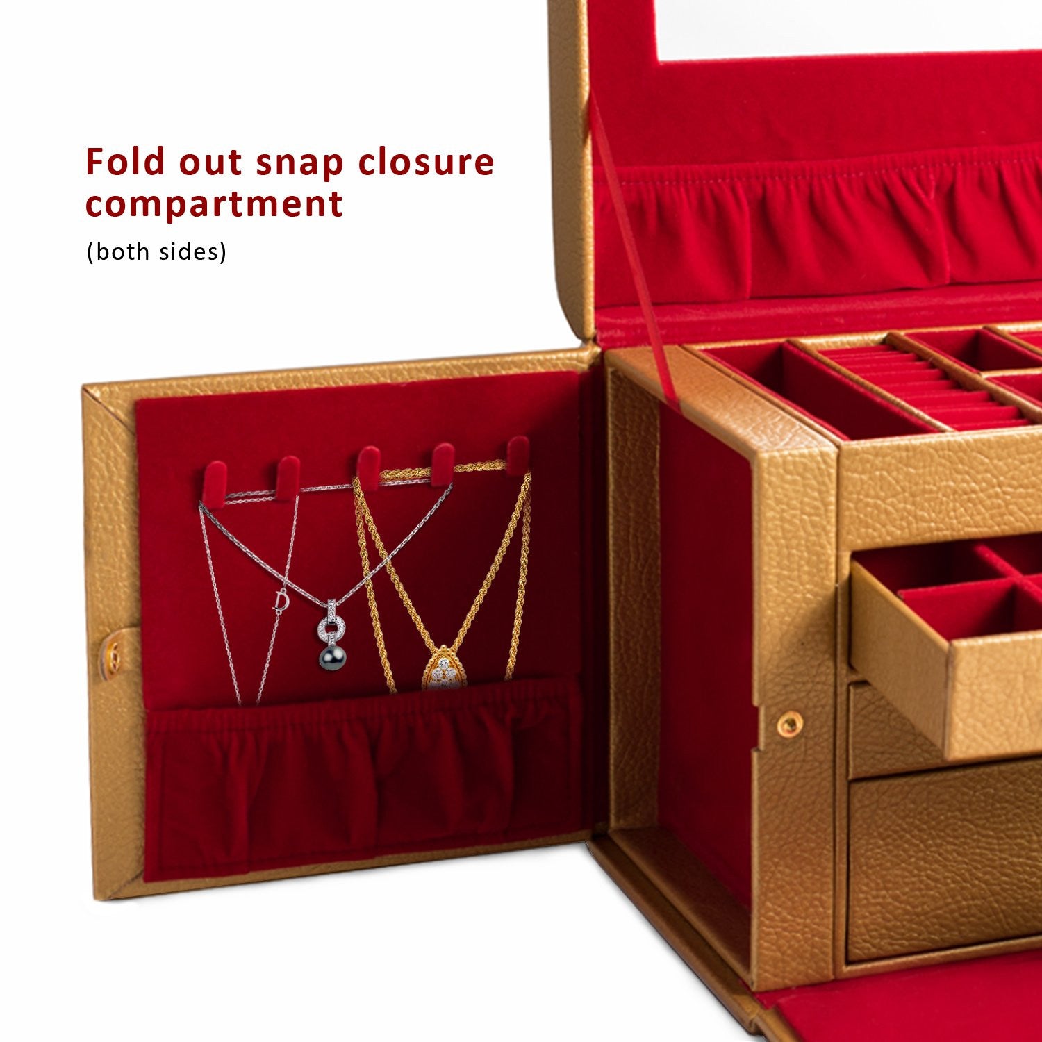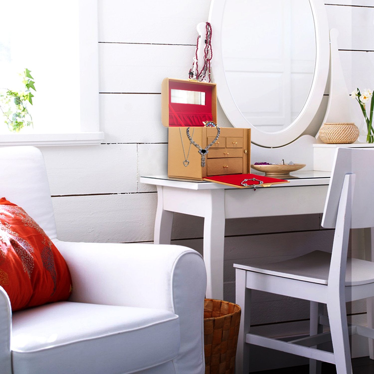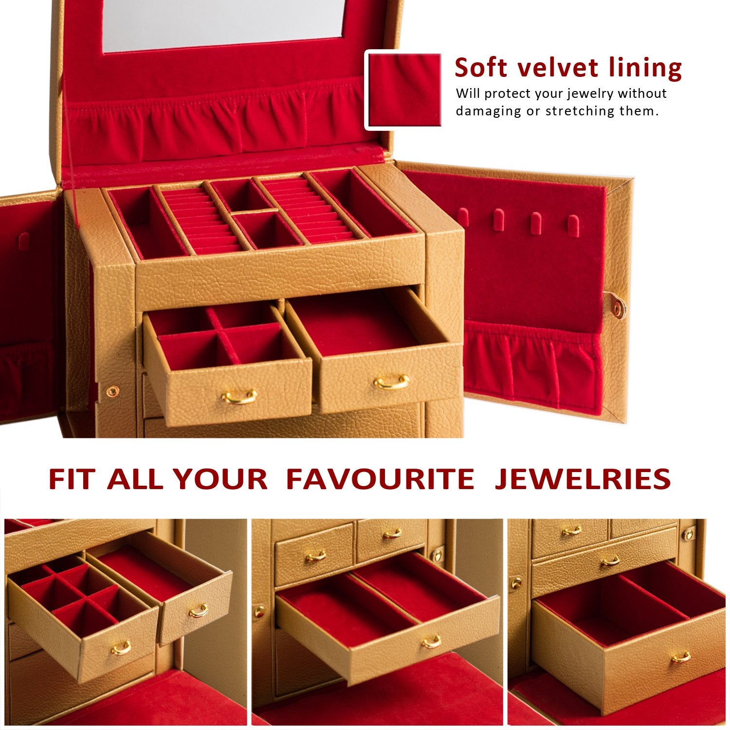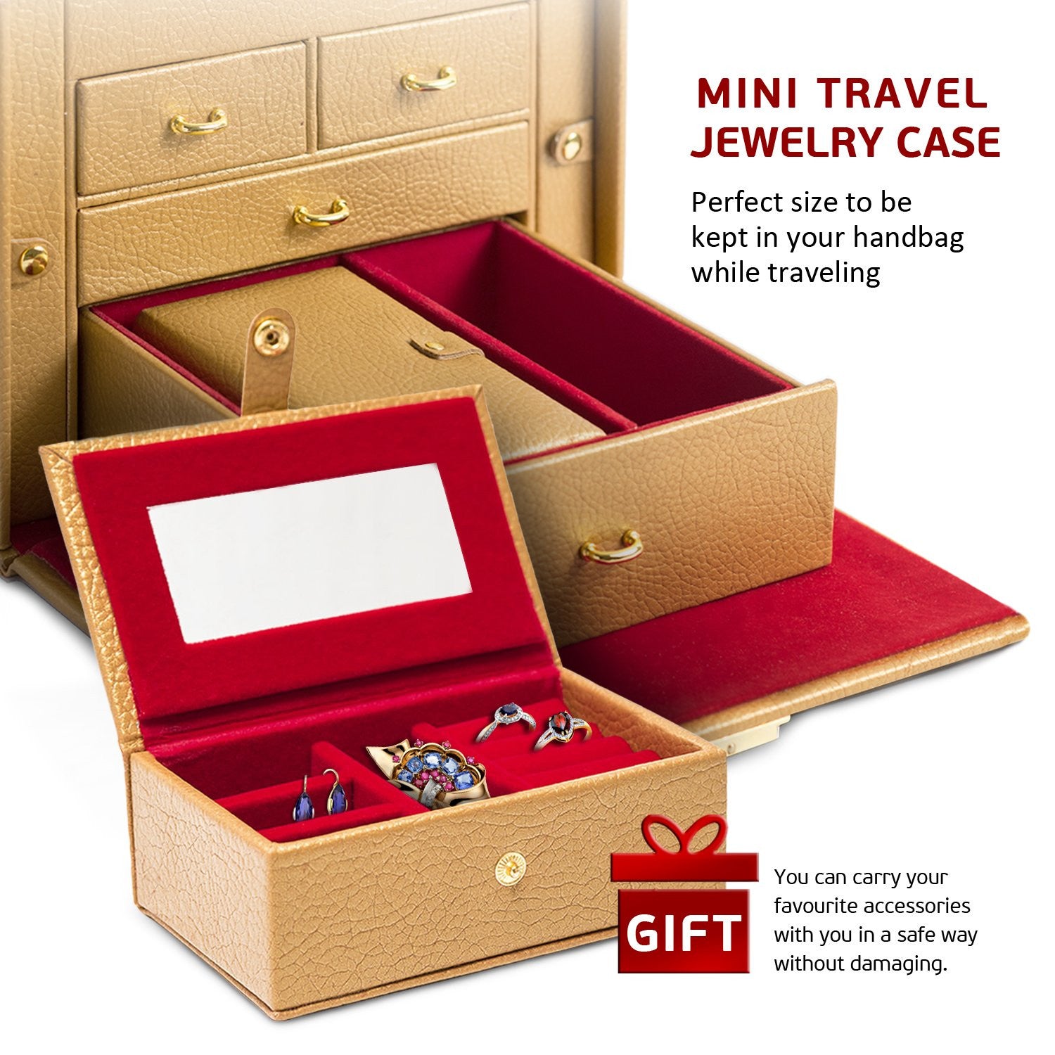Our jewelry organizer is manufactured using top materials. Smooth, shiny gold leather on the exterior and the interior lined in silsuede and soft velvet. Strong seams and durable construction will let you house your jewels for a very long time