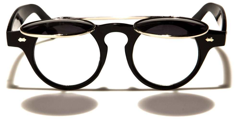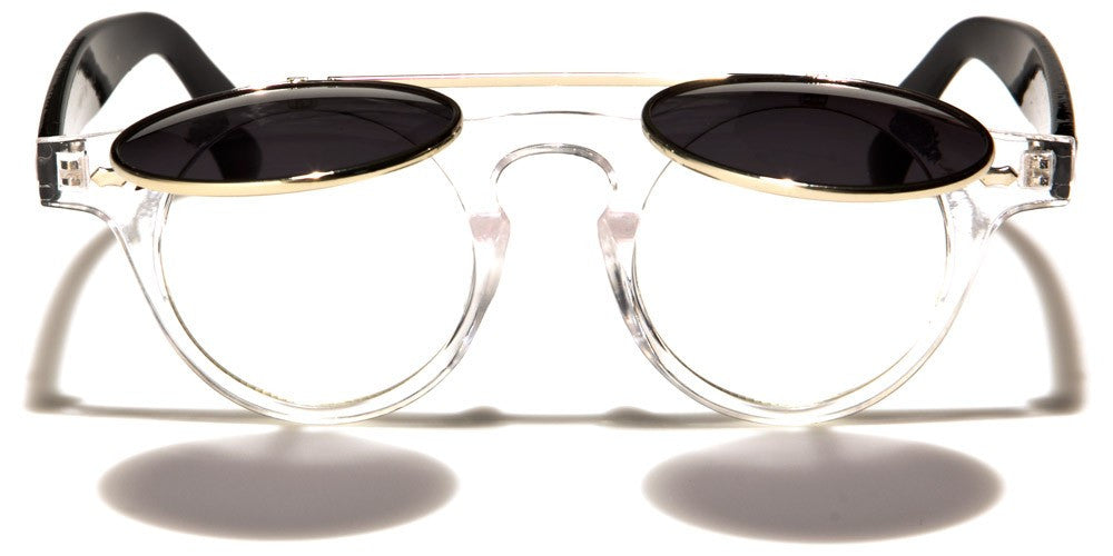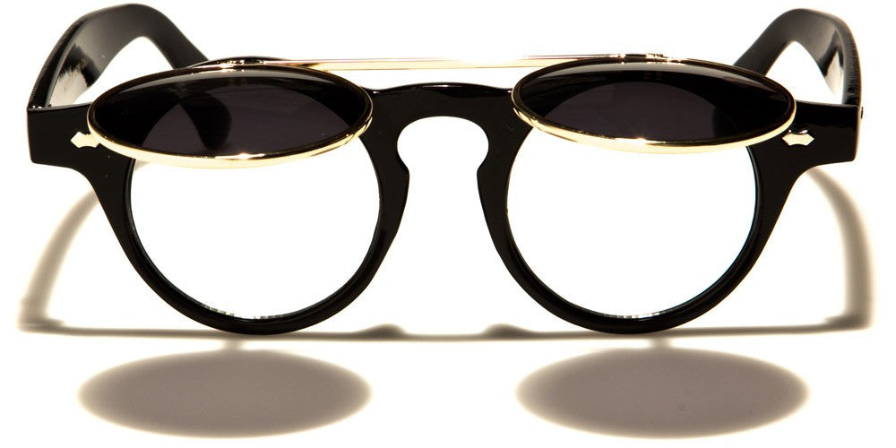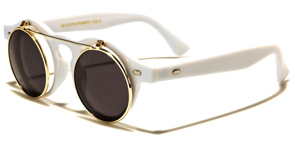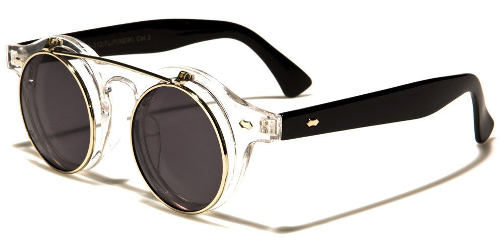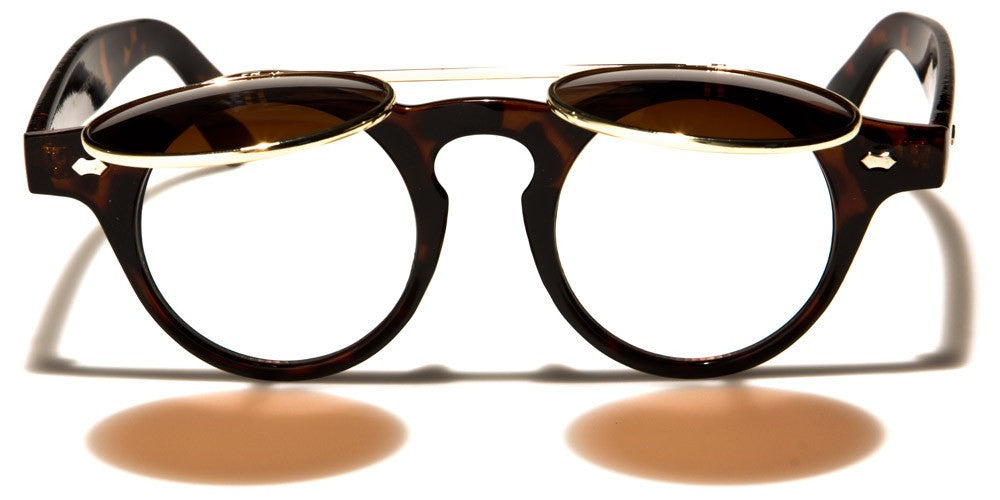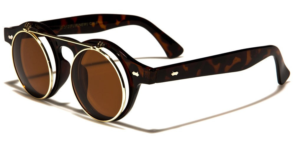 Here's something to flip over for! These round flip-up sunglasses allow you to see the world through their lenses or without. These feature round frames, wrapped in metal, which is further housed by a round plastic frame that comes with a pair of molded nose pads and metallic accents. The frame comes in black, white, clear and brown tortoiseshell. These bulk sunglasses are designed to flatter both masculine and feminine features and come with UV400 lenses in either brown or smoke.
