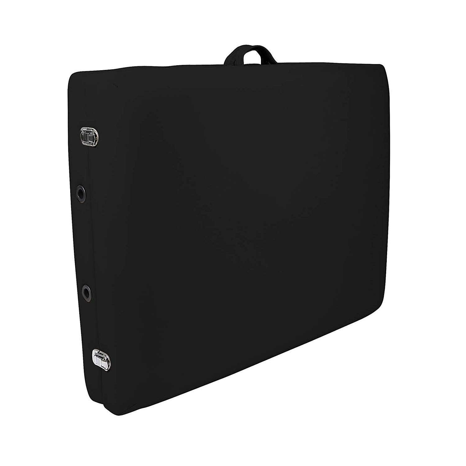 The face cradle can adjust in height and angle for maximum comfort. This table also features an arm sling under the headrest as well as winged armrests, allowing you to comfortably reposition your client as needed. Also included is one half round lumbar support cushion that measures 26" long x 6" wide x 3" high to assist different client preferences. The top of the table features a full 2-1/2” thick layer of high-density foam (our competitors use 1-1/2" foam and simply round their measurements to 2") covered in luxurious PU synthetic leather. PU leather is vegan-friendly, softer than PVC, has no offensive smell, and is oil and water-proof. The face pillow contains 3” of foam with a removable cover. The table legs have solid, non-slip, non-marring feet to prevent sliding and protect all types of floors. Weighing in at just over 30 pounds, the table folds in half (like a suitcase), locks with two professional chrome clasps, and is easy to move with double handles on one side and non-marring feet on the other.
