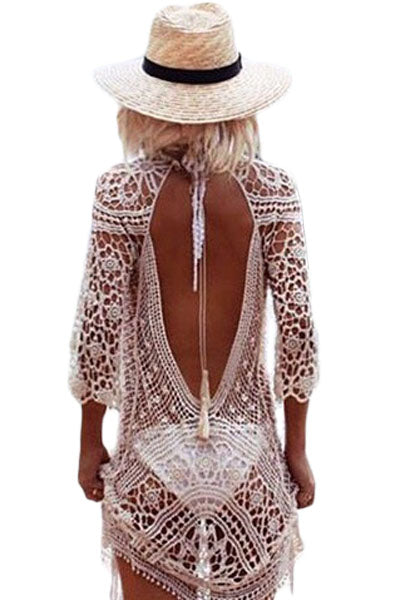 Fresh and refined beachwear definitely cause continually screams from crowds around. The thigh-skimming crochet beach throw makes a statement with a gorgeous scoop open back with tassel neck tie. Featuring a round neckline, 3/4 scallop hem sleeves, and delicate tassel detail hem. Great for those who love to show off their best asset but in a subtle way!