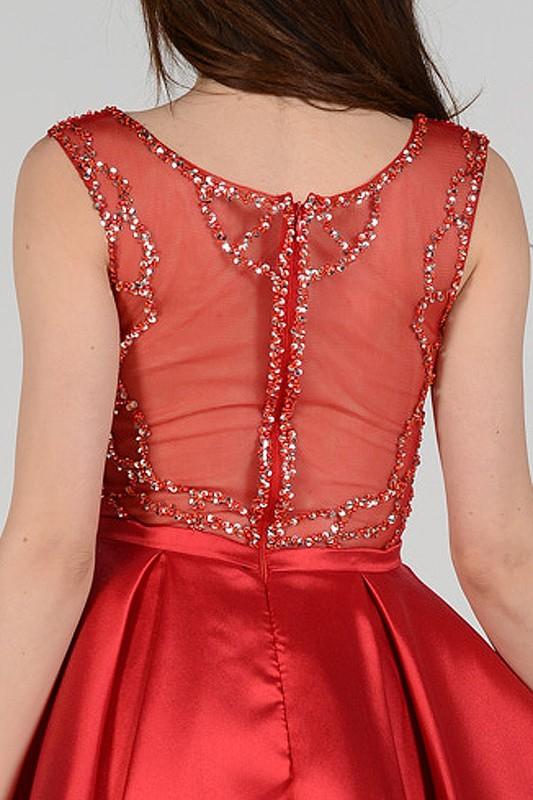 Show off your inner fashionista with this sheer illusion sweetheart neckline gold sequins bodice red homecoming dress. A trendy sleeveless formal dress accented a thin belt at the waist and a fun, flirty satin skirt with side pockets. This gorgeous homecoming dress is perfect for any other special occasion such as prom, pageant or a special night out.