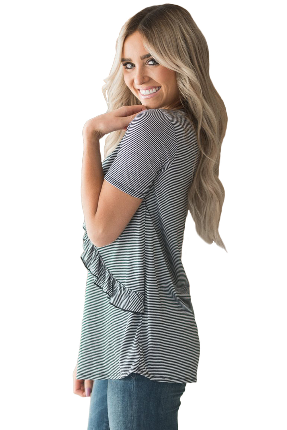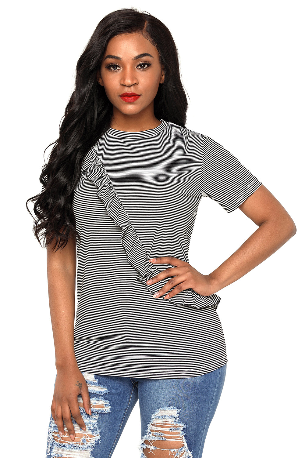 Short Sleeves Pinstripe Tee with Diagonal Ruffled Detail
