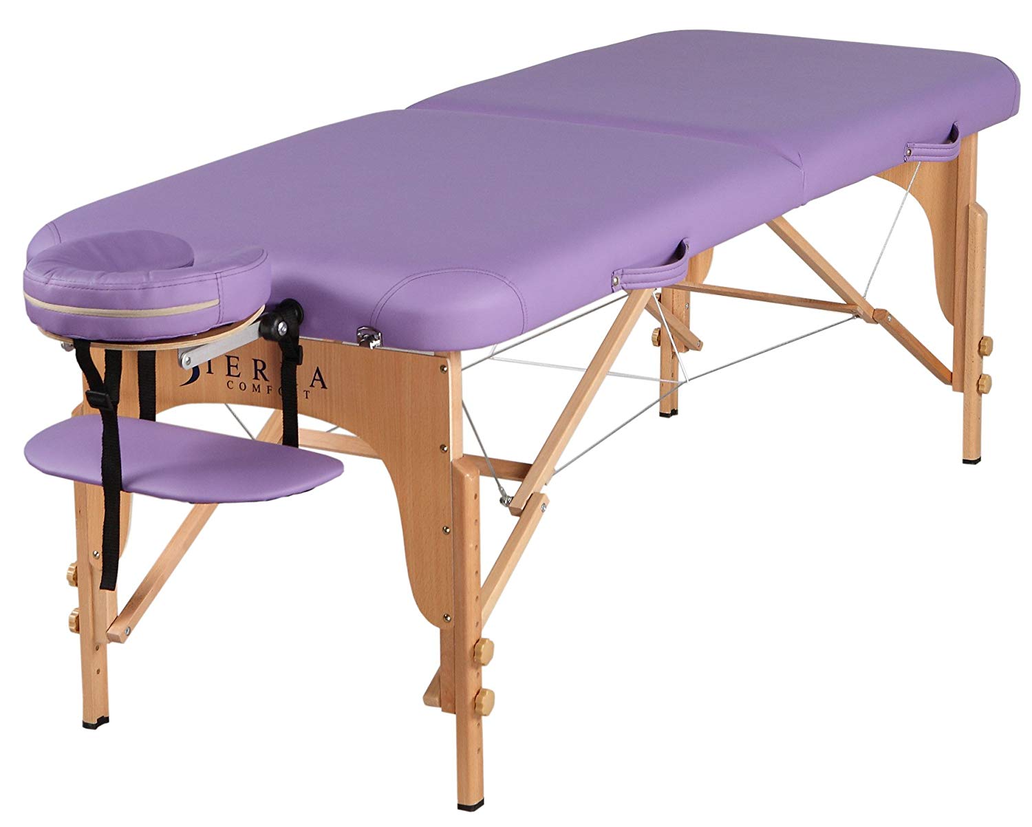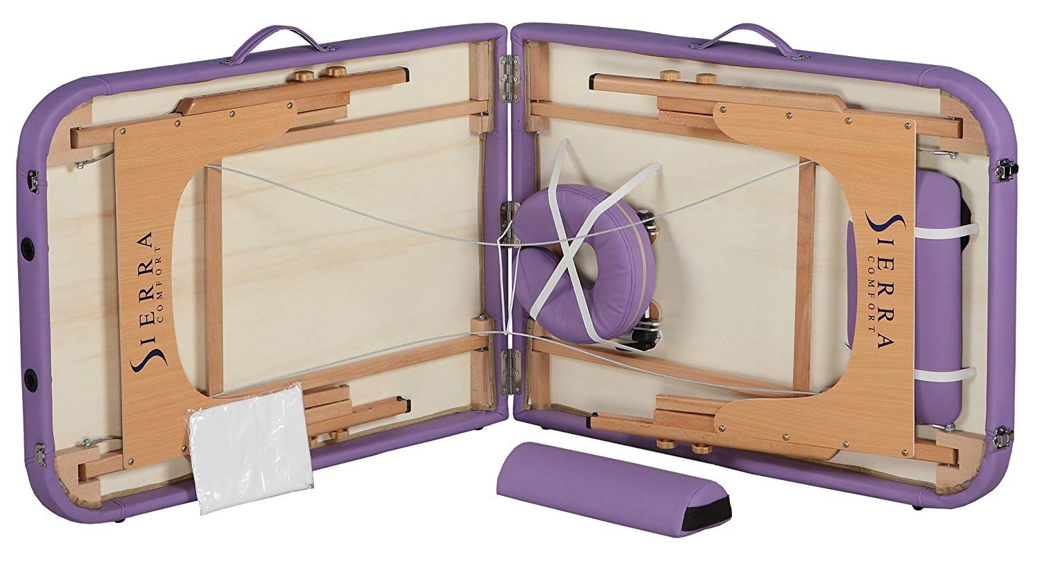 The Sierra Comfort SC-601 Soothe Portable Massage Table is made of sturdy beech hardwood with 2.5 Inch of high density foam for a deluxe massage experience. This package includes two ergonomically designed half-round bolsters for additional comfort and support. The bolsters conform to the body's natural curves and are filled with high density foam for durability. Clients will enjoy the included adjustable face cradle that can be easily positioned on the backrest or the head of the table. An optional forward arm rest is also included. You can carry your massage table conveniently in the zippered carry case that is also provided with this product.