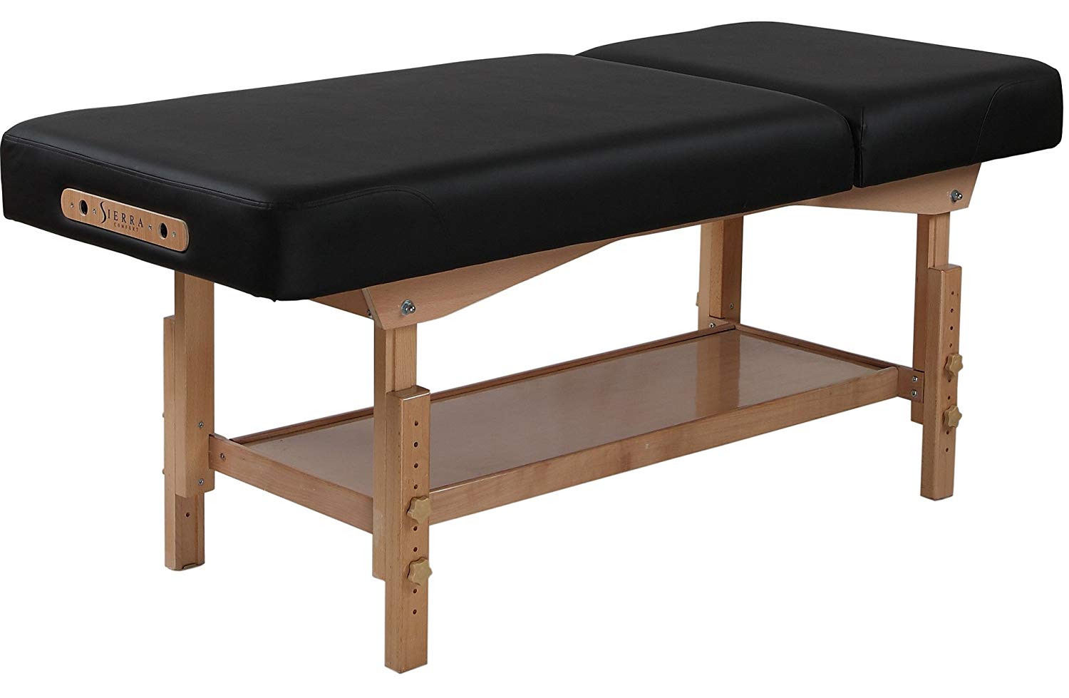 The Sierra Comfort SC-2001 Two-Section Stationary Table is preferred by industry professionals worldwide and offered at an uncontested value. Constructed of beech hardwood, our stationary tables provide enhanced support and durability. Featuring an adjustable multi-position backrest, the client can be moved to an upright position for optional techniques and procedures. The PU-leather high density foam deck is oil resistant and waterproof, and provides the exceptional comfort we are known for. The height of the table adjusts manually from 27 to 36-inches; allowing the user to position the table accordingly when treating clients. The built-in storage shelf is a space saver and adds convenience for storing your accessories. The ergonomic face cradle and pillow is used to cushion the client's face with even pressure allowing for pure relaxation. Whether a Spa, Salon, Massage Parlor, Gym or Household user, our tables fit the needs to satisfy all.