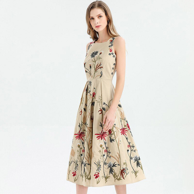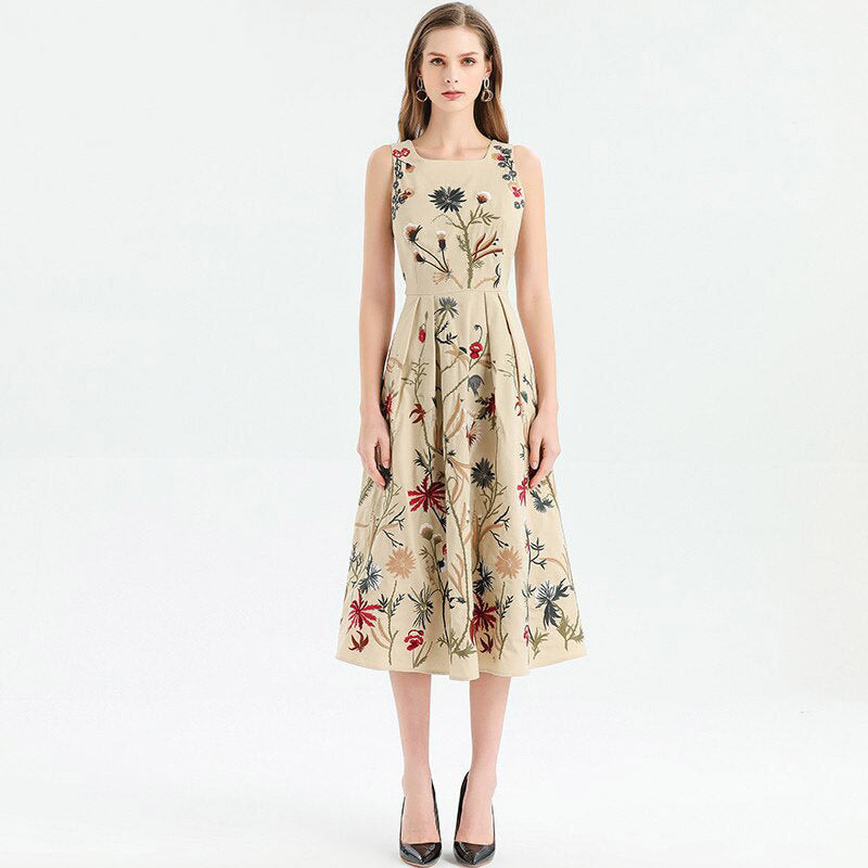 Sleeveless Flowers Embroidery Elegant Midi Dresses