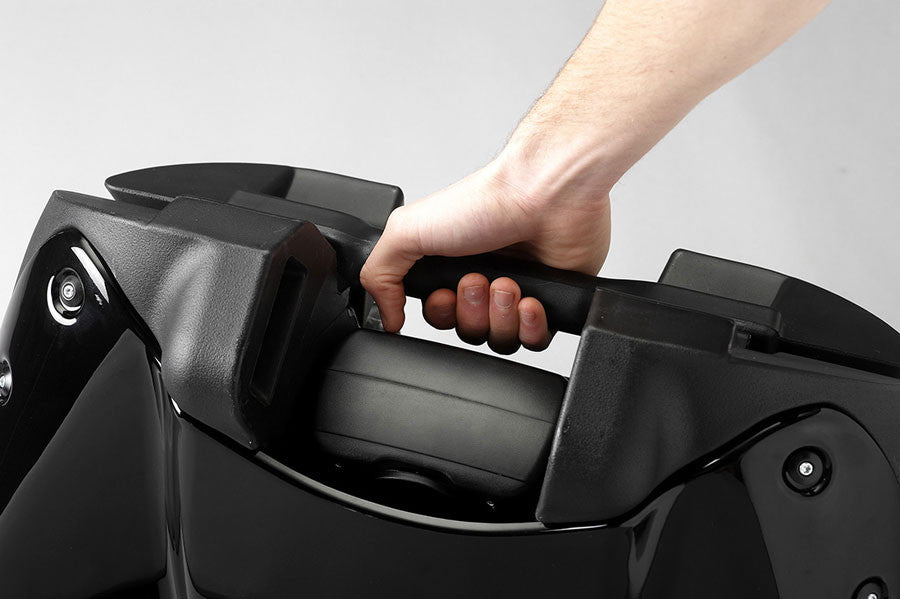 To set up the F1 Lithium at the club, simply pull the chassis open so that it rests on all 4 magnesium alloy wheels. Then locate the golf bag on the front of the chassis and rest it back in to place. The action of raising the handle engages two fins into the chassis, which locks everything together to create a rigid structure.